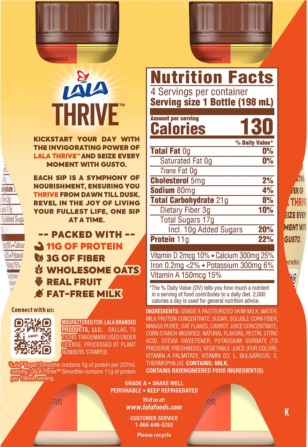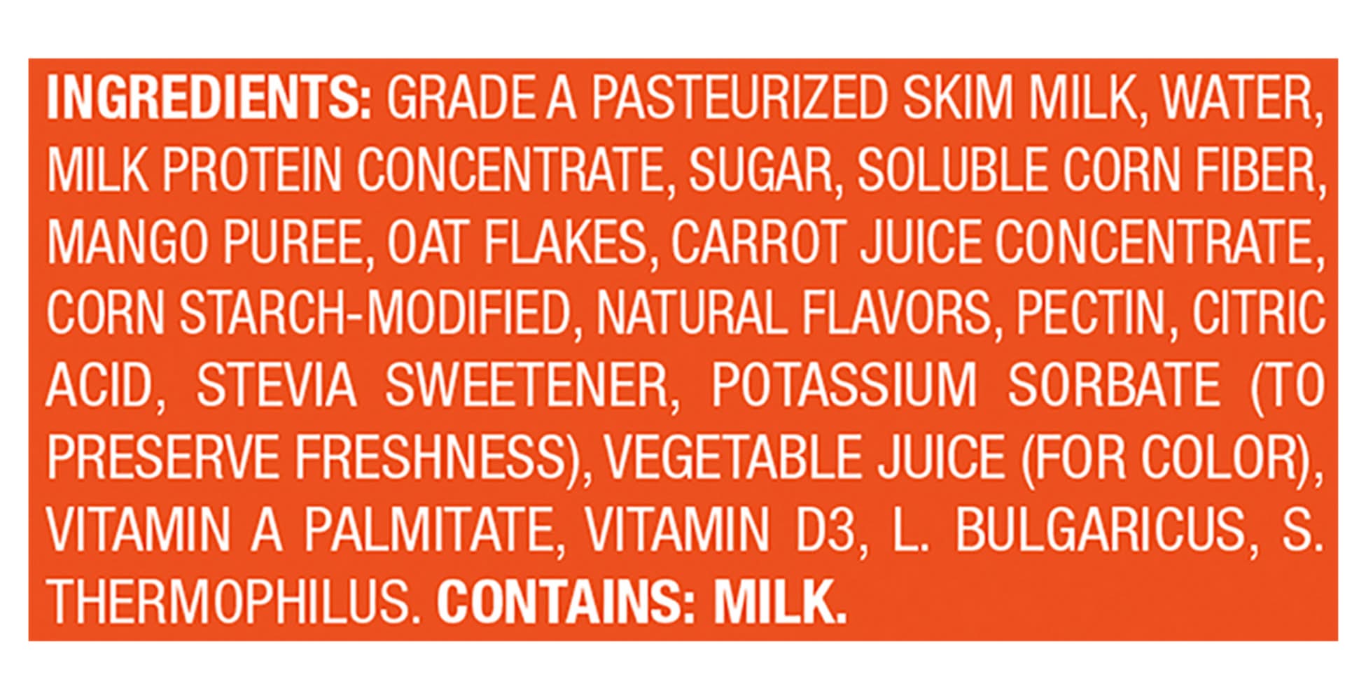 Ingredients: Grade A Pasteurized Skim Milk, Water, Milk Protein Concentrate, Sugar, Soluble Corn Fiber, Mango Puree, Oat Flakes, Carrot Juice Concentrate, Corn Starch-Modified, Natural Flavors, Pectin, Citric Acid, Stevia Sweetener, Potassium Sorbate (to Preserve Freshness), Vegetable Juice (for Color), Vitamin A Palmitate, Vitamin D3, L. Bulgaricus, S. Thermophilus Contains: Oat, Milk, Corn