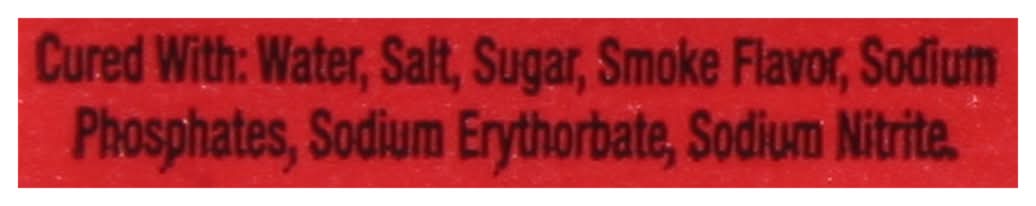 Ingredients: Cured with: Water, Salt, Sugar, Smoke Flavor, Sodium Phosphates, Sodium Erythorbate, Sodium Nitrite