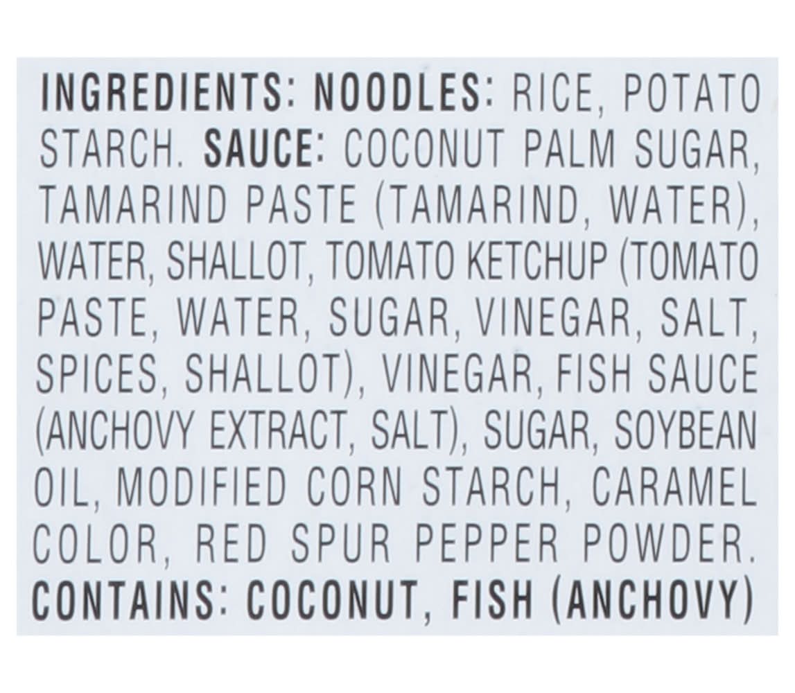 Ingredients: Noodles: Rice, Potato Starch. Sauce: Coconut Palm Sugar, Tamarind Paste (Tamarind, Water), Water, Shallot, Tomato Ketchup (Tomato Paste, Water, Sugar, Vinegar, Salt, Spices, Shallot), Vinegar, Fish Sauce (Anchovy Extract, Salt), Sugar, Soybean Oil, Modified Corn Starch, Caramel Color, Red Spur Pepper Powder Contains: Tree Nuts, Coconuts, Fish, Fish, Anchovy, Corn, Soybeans