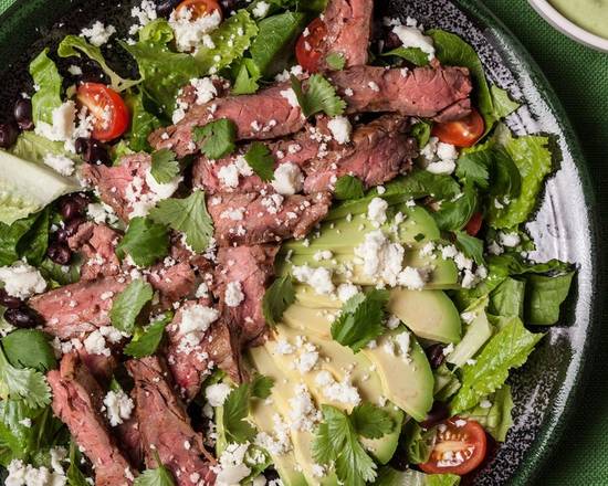 Serves 2. Certified grass-fed NY strip steak served on organic mix greens, tomatoes, avocado, carrots, cucumbers, olives, crumble blue cheese, Caesar dressing.
