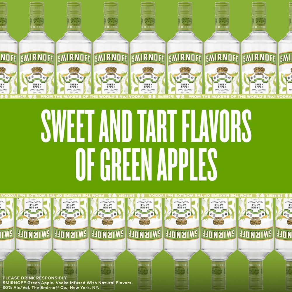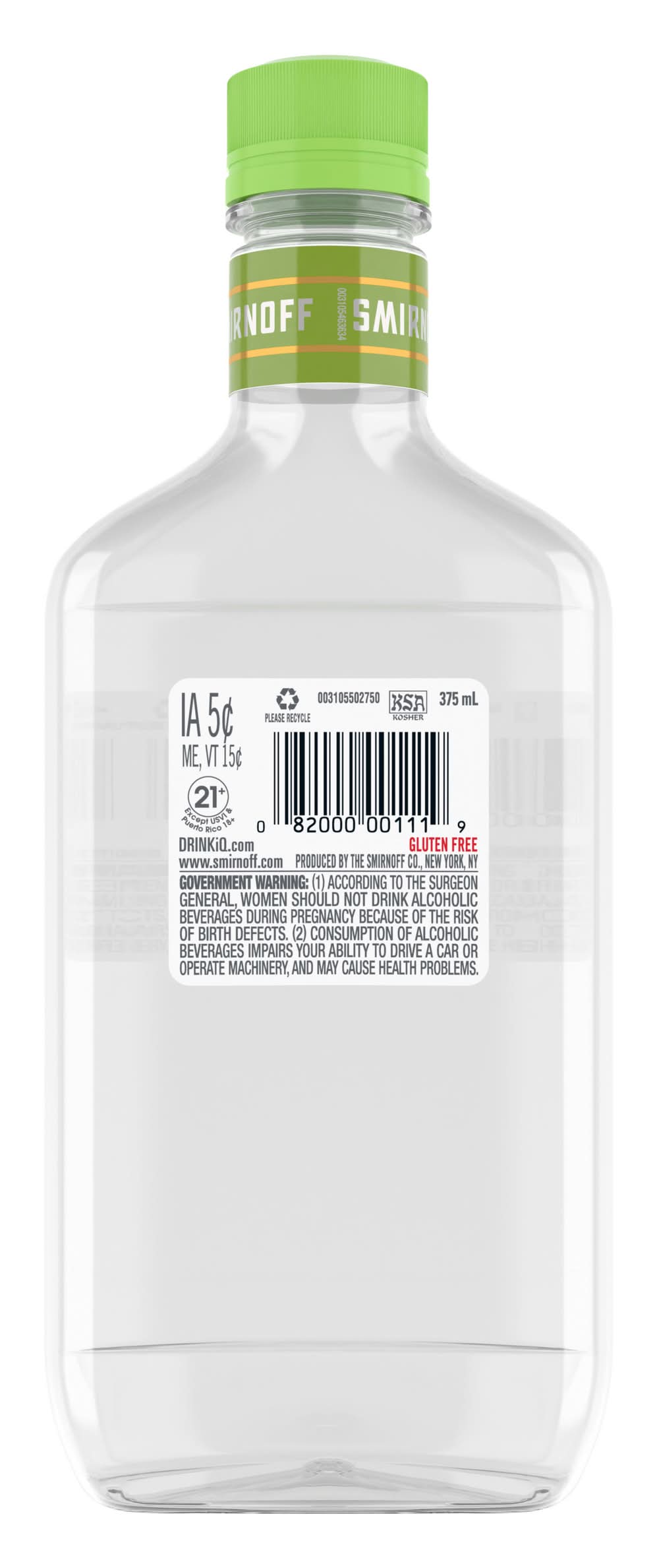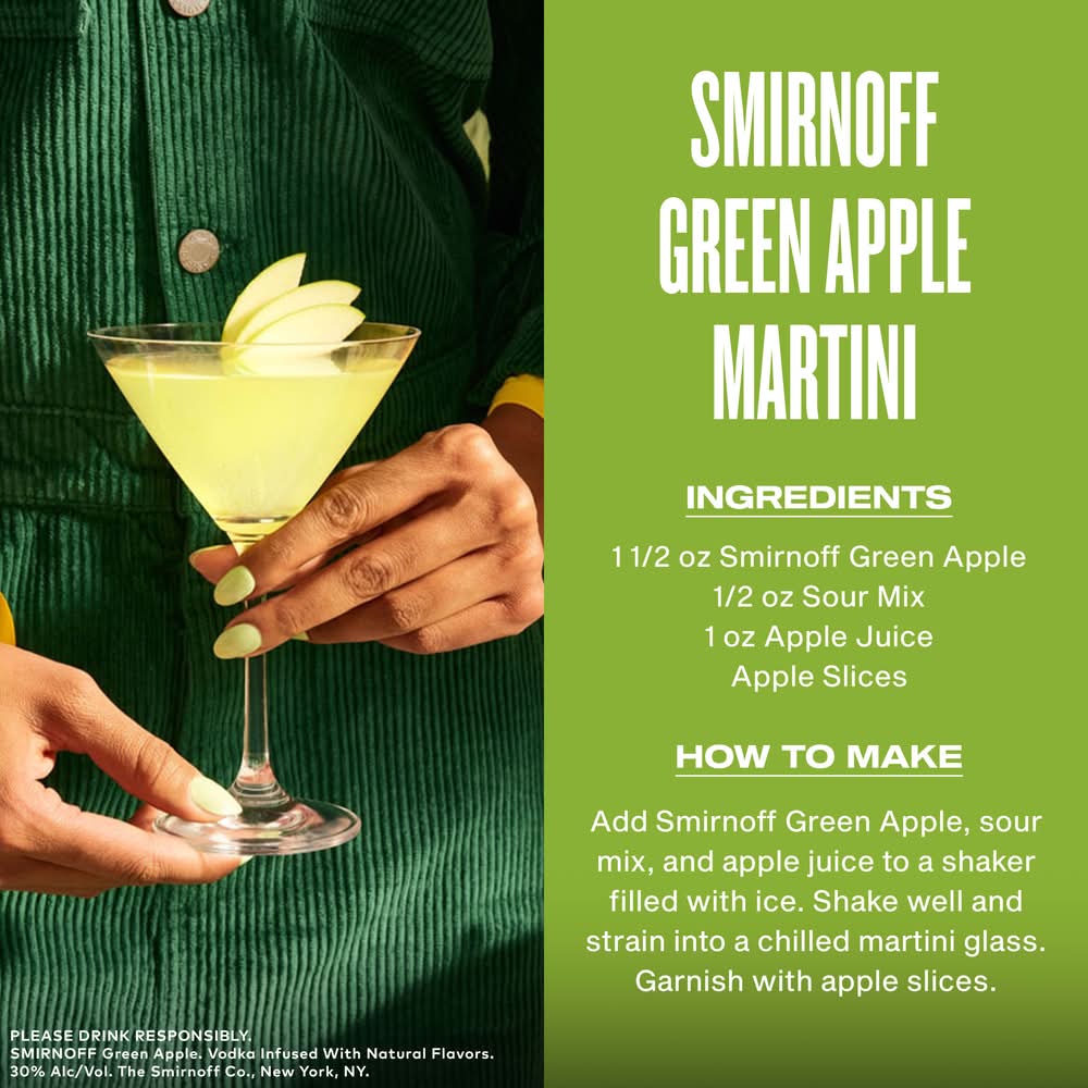 Infused with the naturally tart yet sweet flavor of green apples, Smirnoff Green Apple is a refreshing-tasting drink perfect for shots or cocktails. Its crisp yet smooth taste pairs well with soda water, lemonade, or pineapple juice. For a tangy twist, mix with lemon juice, simple syrup, and a muddled basil sprig, then top with soda for a delightful Smirnoff Basil Apple cocktail. Smirnoff Green Apple's versatility makes it an excellent gift option and a treat for creating a variety of delicious cocktails. Includes one 60 proof 375 mL bottle of Smirnoff Green Apple. Please enjoy responsibly. • Flavor: Green apple • Alcohol by volume: 35% • Packaging: Reusable