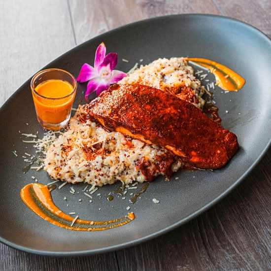 Salmon fillet in our anticuchera sauce, mounted on risotto and three-color quinoa in white truffle cream with a side of our special sauce of peruvian chilies and sesame oil
