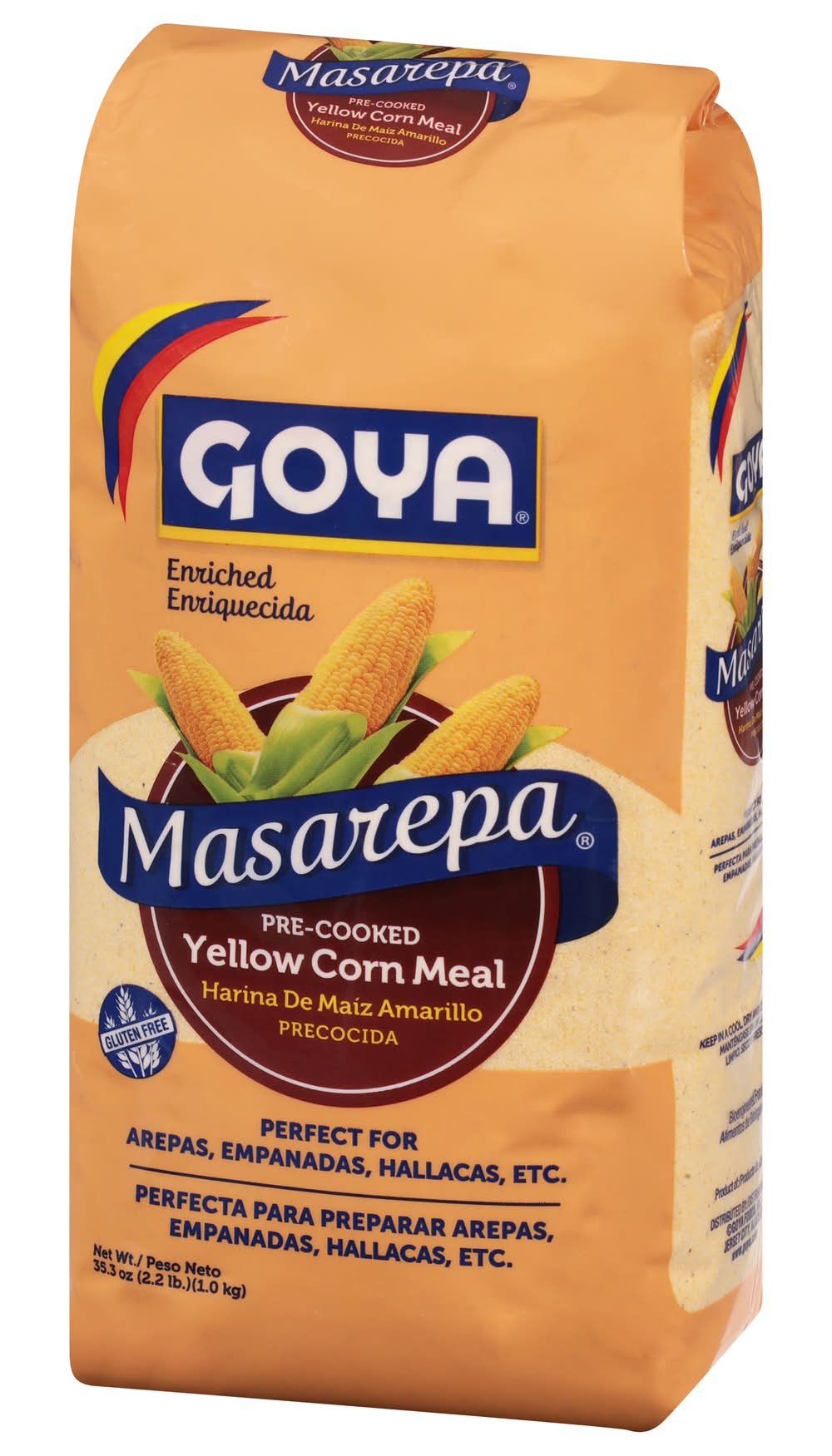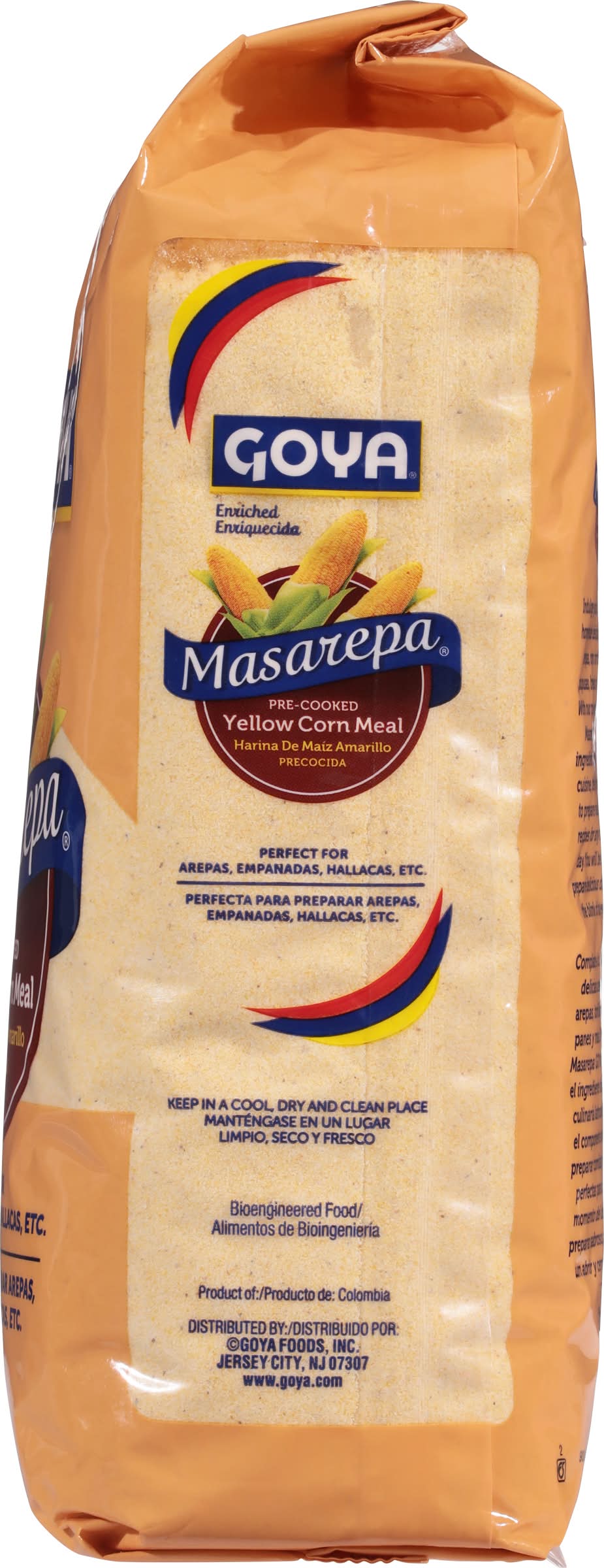 Goya Masarepa Pre-Cooked Yellow Corn Meal is suited for preparing a variety of homemade Latin American dishes. It is pre-cooked, which simplifies the cooking process, allowing for the creation of arepas, corn tortillas, pupusas, and breads. Goya foods, Inc., Jersey City,NJ