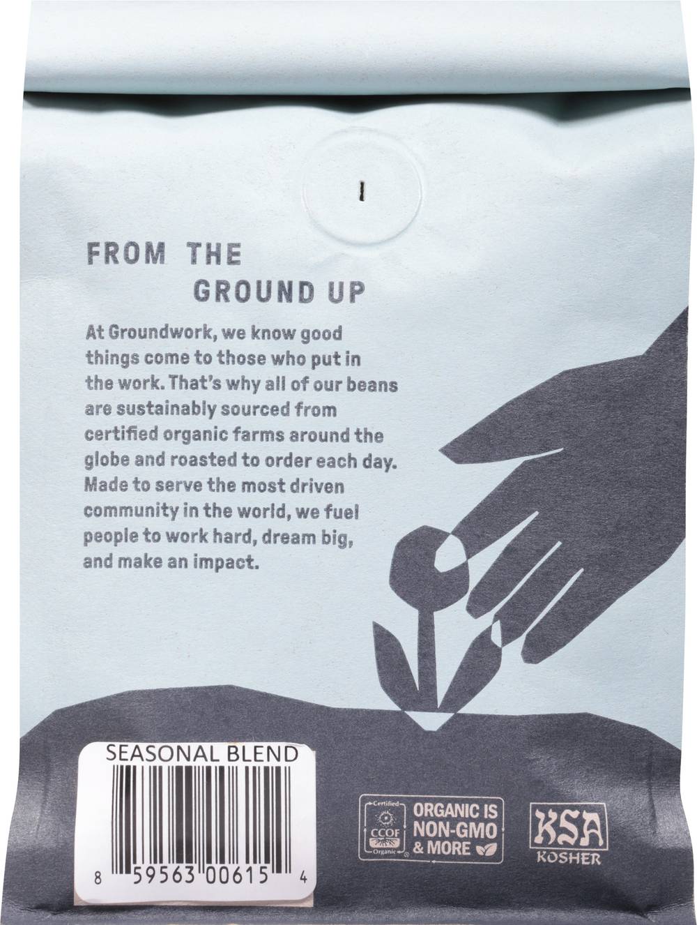 Notes of concord grape and apple. Organic is non-GMO & more. From the Ground Up: At Groundwork, we know good things come to those who put in the work. That's why all of our beans are sustainably sourced from certified organic farms around the globe and roasted to order each day. Made to serve the most driven community in the world, we fuel people to work hard, dream big, and make an impact. Always Organic: We've been pioneering organic coffee sourcing since the early '90s. Quality over quantity. Relationship Based: We work closely with our partners at origin to ensure their farms and communities are thriving. That's how it should be. Since 1990. Put in the Work! www.groundworkcoffee.com. Biotre: Made from compostable material. Planet Focused: From eco-friendly packaging to energy-efficient roasting, we prioritize the earth every step of the way. It's worth the effort.
