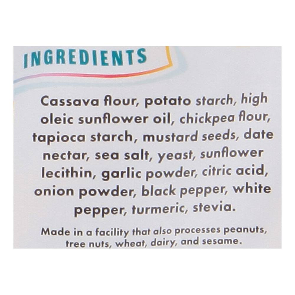 Ingredients: Cassava Flour, Potato Starch, High Oleic Sunflower Oil, Chickpea Flour, Tapioca Starch, Mustard Seeds, Date Nectar, Sea Salt, Yeast, Sunflower Lecithin, Garlic Powder, Citric Acid, Onion Powder, Black Pepper, White Pepper, Turmeric, Stevia Contains: Mustard, Peanuts, Tree Nuts, Wheat, Milk, Sesame