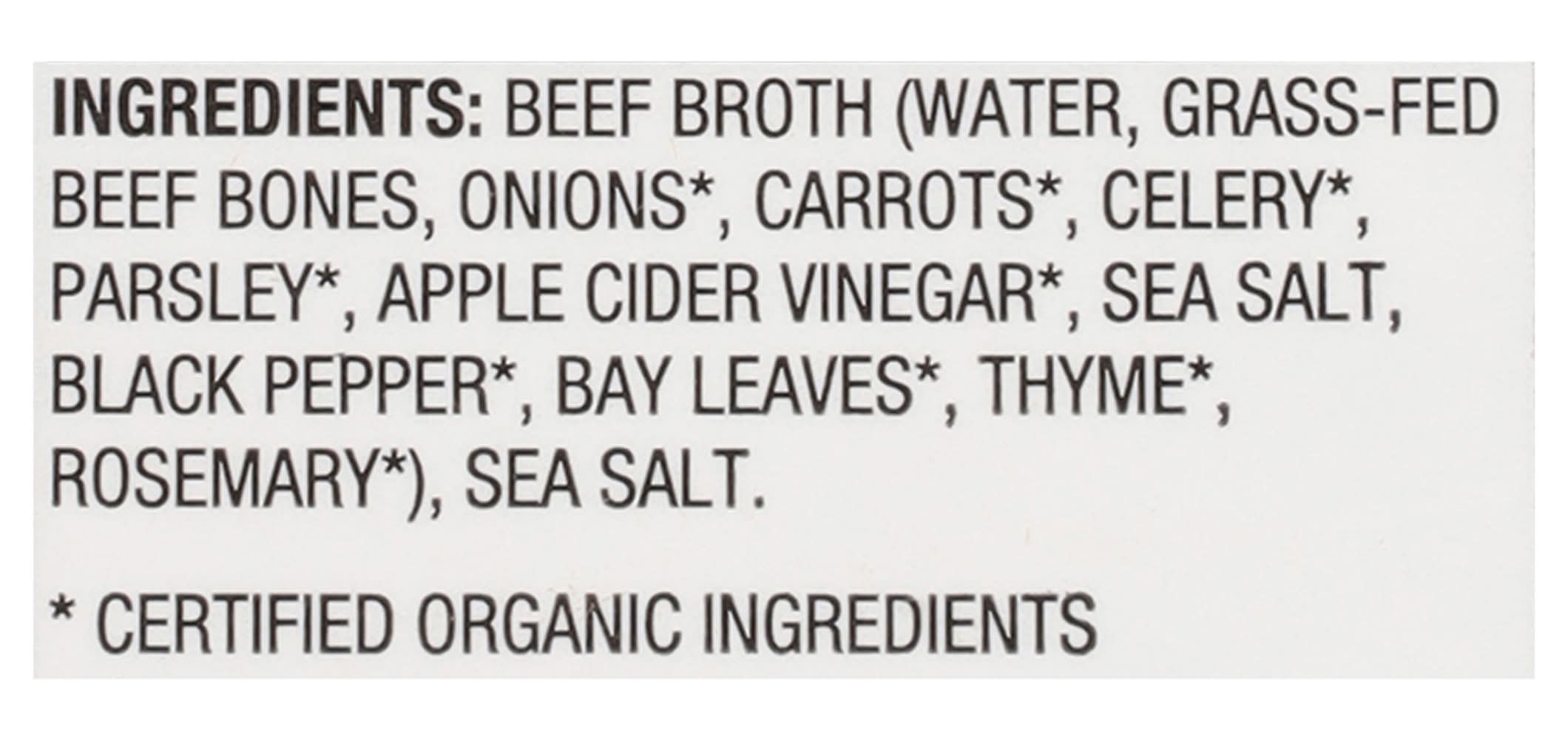 Ingredients: Beef Broth (Water, Grass-Fed Beef Bones, Onions*, Carrots*, Celery*, Parsley*, Apple Cider Vinegar*, Sea Salt, Black Pepper*, Bay Leaves*, Thyme*, Rosemary*), Sea Salt. * Certified Organic Ingredients
