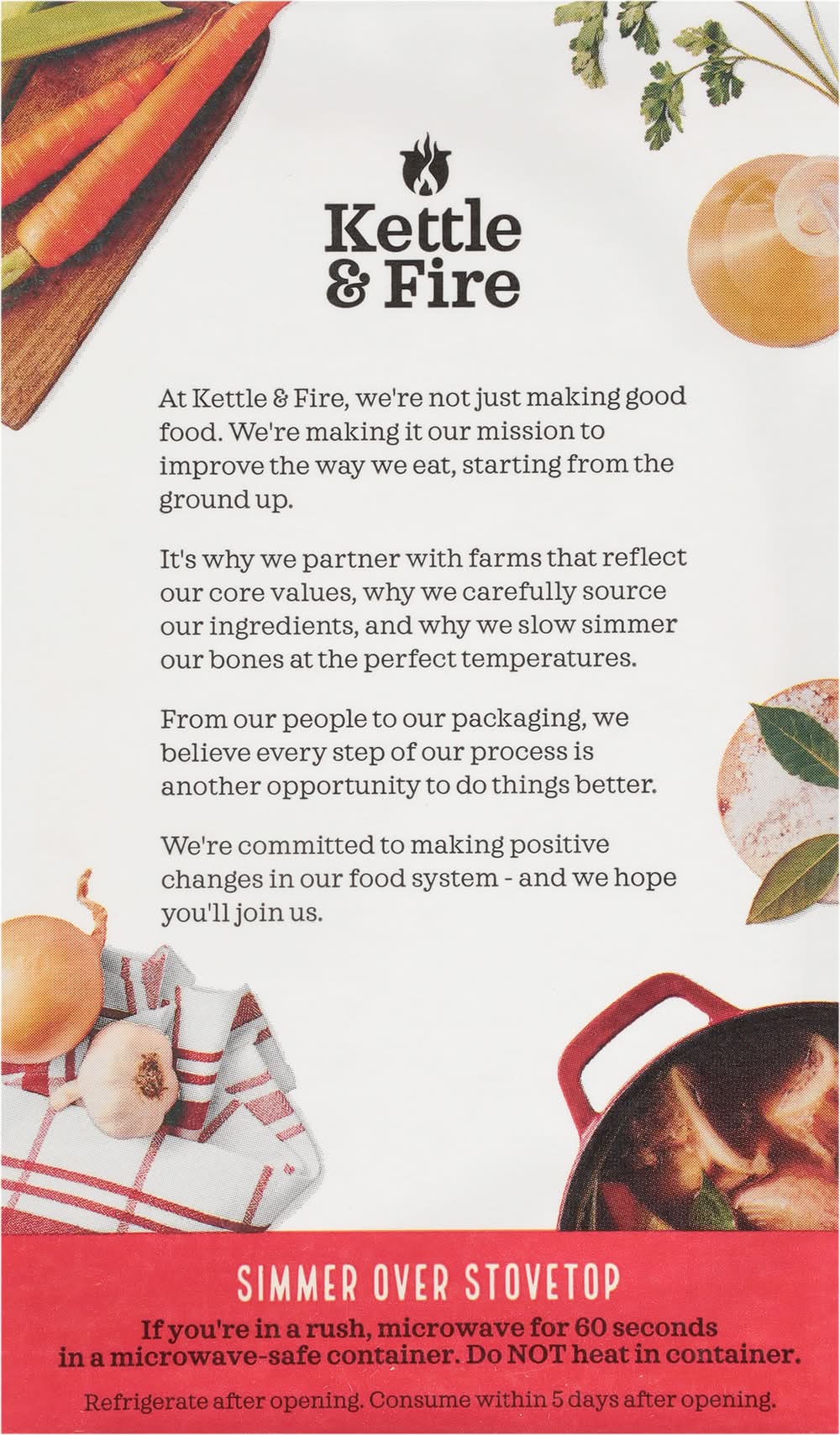 Directions for use: Simmer over stovetop for best results. If you're in a rush, microwave for 60 seconds in a microwave-safe container. Kettleandfire.com/tips. Refrigerate after opening. Lift here. Consume within 5 days after opening. Storage recommendation: Refrigerate after opening.