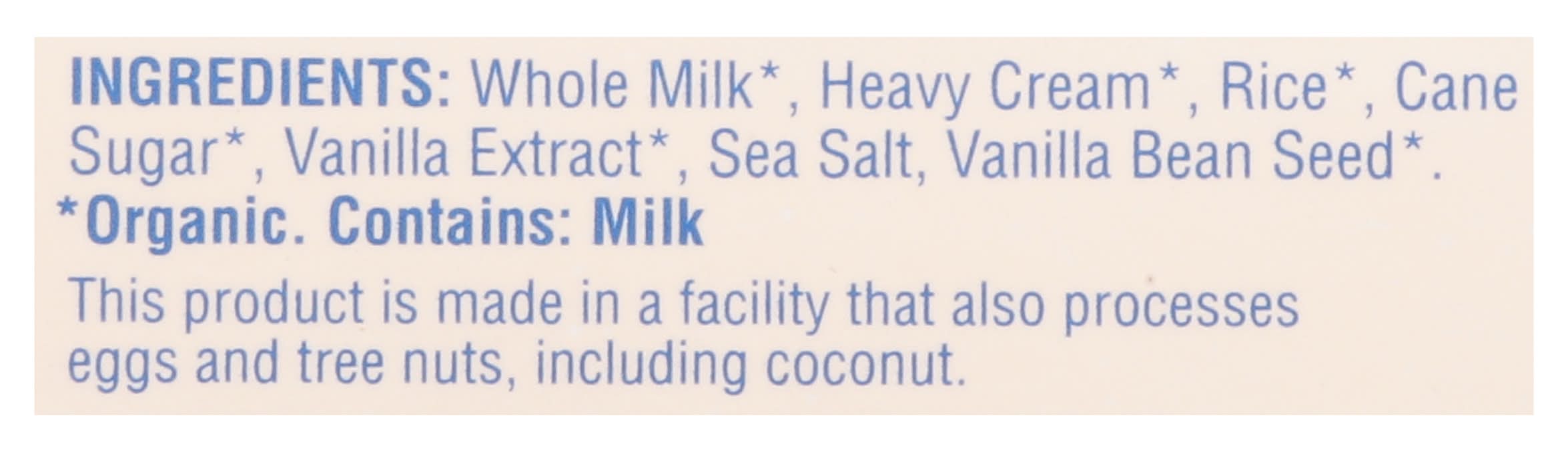 Ingredients: Whole Milk (Organic), Heavy Cream (Organic), Rice (Organic), Cane Sugar (Organic), Vanilla Extract (Organic), Sea Salt, Vanilla Been Seeds (Organic) Contains: 'Milk Contains', 'Eggs May Contain', 'Tree Nuts May Contain', 'Tree Nuts May Contain', 'Gluten Free From'