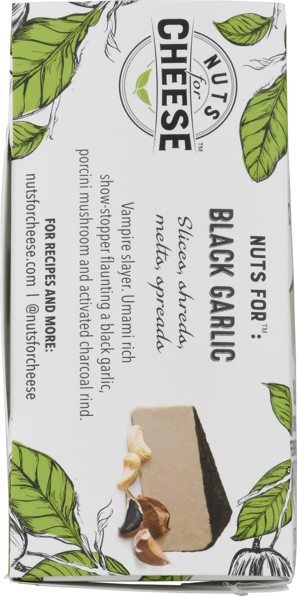 Vegan. Organic & Dairy-free. USDA Organic. Dairy-free. Certified Organic by Pro-Cert. Tastes good, does good, feels good. You can have it all. Stay cheesy! - Margaret Coons. Vegan Chef, Founder, and CEO. Nuts for: Black Garlic. Slices, shreds, melts, spreads. Vampire slayer. Umami rich show-stopper flaunting a black garlic, porcini mushroom and activated charcoal rind. nutsforcheese.com. For Recipes and More: nutsforcheese.com; (at)nutsforcheese. • Flavor: Black garlic • Number of servings: 4 • Packaging: Reusable