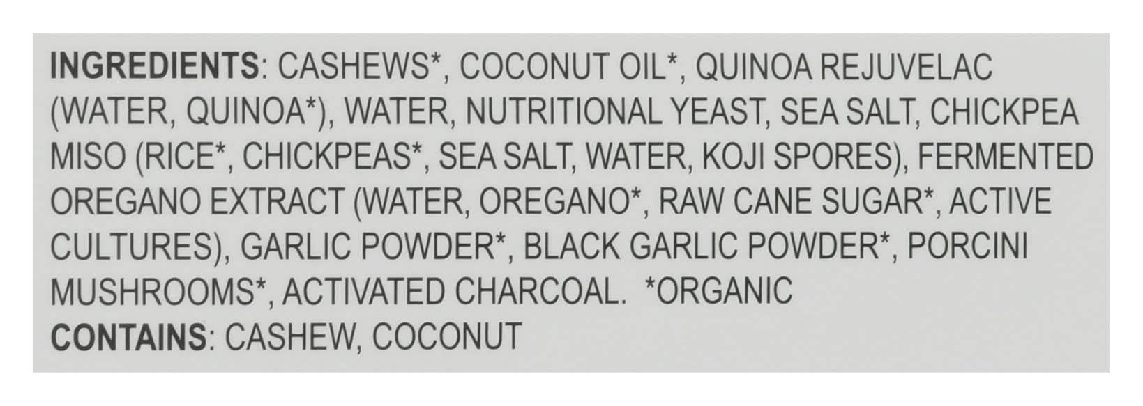 Ingredients: Cashews (Organic), Coconut Oil (Organic), Quinoa Rejuvelac (Water Quinoa (Organic)), Water, Nutritional Yeast, Sea Salt, Chickpea Miso (Rice (Organic), Chickpeas (Organic), Sea Salt, Water, Koji Spores), Fermented Oregano Extract (Water Oregano (Organic), Raw Cane Sugar (Organic), Active Cultures), Garlic Powder (Organic), Black Garlic Powder (Organic), Porcini Mushrooms (Organic), Activated Charcoal Contains: Tree Nuts