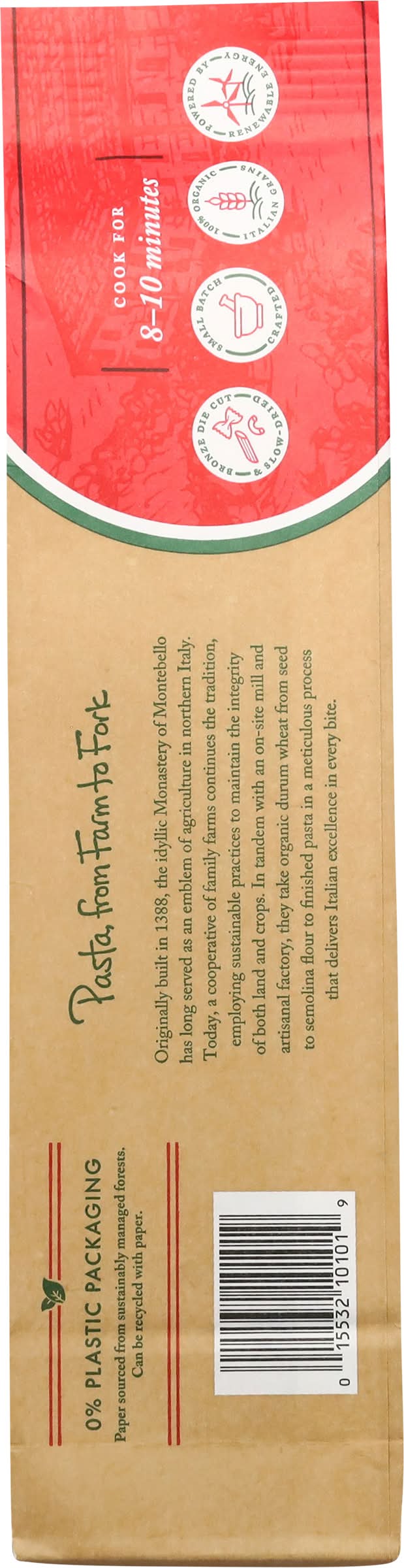 It is crafted using time-honored techniques from Italy. Originating from the hills overlooking the Adriatic Sea, durum wheat semolina is meticulously ground and merged with pure mountain spring water to form a fine dough. The dough is shaped using hand-made bronze dies, resulting in a rough texture. Slow drying in traditional rooms rather than flash drying in ovens helps preserve the unique porous texture that ensures even cooking and excellent sauce retention. Grown on family farms and produced at the Monastero di Montebello in Marche, Italy, this artisan pasta is certified organic by Quality Assurance International, reflecting a commitment to natural agriculture and environmental stewardship that has been maintained since 1388. Number of servings: 8