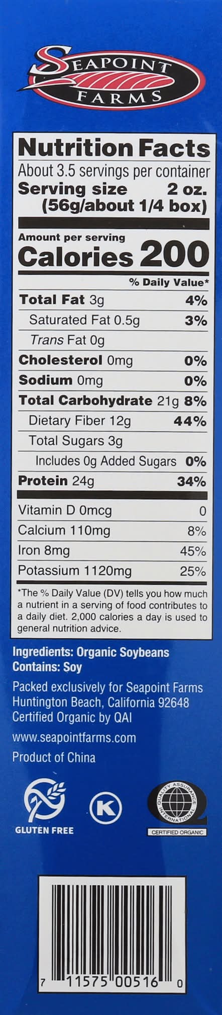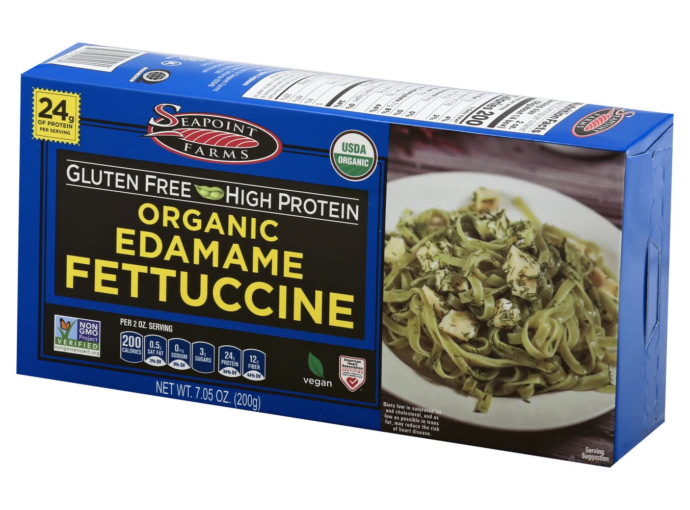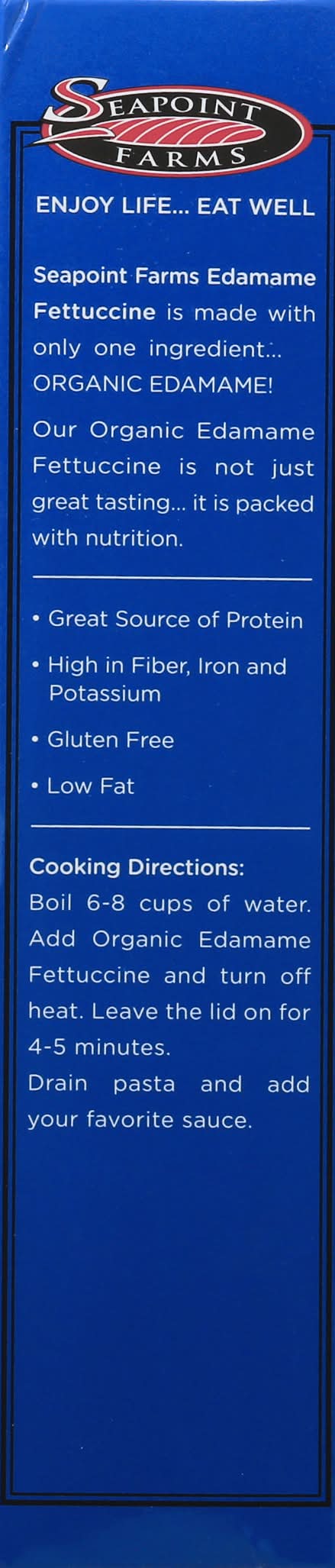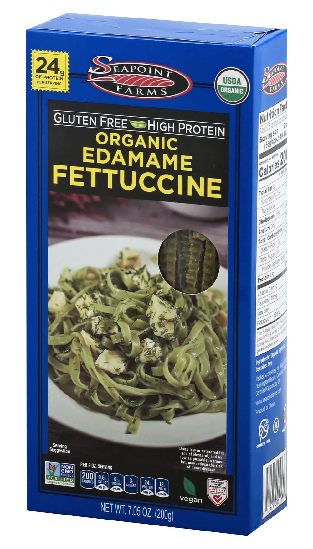 24 g of protein per serving. Per 2 oz Serving: 200 calories; 0.5 g sat fat (3% DV); 0 mg sodium (0% DV); 3 g sugars; 24 g protein (34% DV); 12 g fiber (44% DV). Gluten free. USDA Organic. Vegan. Low fat. Quality Assurance International: Certified organic. Certified Organic by QAI. High protein. Non GMO Project Verified. nongmoproject.org. Diets low in saturated fat and cholesterol, and as low as possible in trans fat, may reduce the risk of heart disease. American Heart Association Certified: Meets criteria for heart-healthy food. Enjoy life - eat well. Seapoint Farms edamame fettuccine is made with only one ingredient - organic edamame! Our organic edamame fettuccine is not just great tasting - it is packed with nutritioin. Great source of protein; High in fiber, iron and potassium. www.seapointfarms.com. Product of China. Seapoint Farms, Huntington Beach, CA 92648