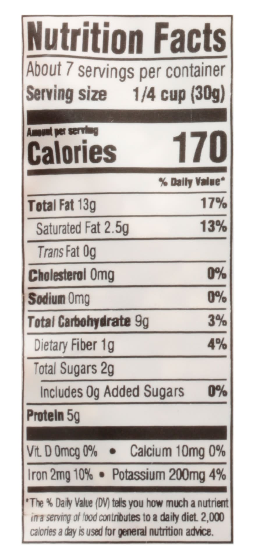 Ingredients: Organic Cashew Contains: Tree Nuts, Cashews, Peanuts, Tree Nuts, Soybeans, Wheat, Sesame, Milk
