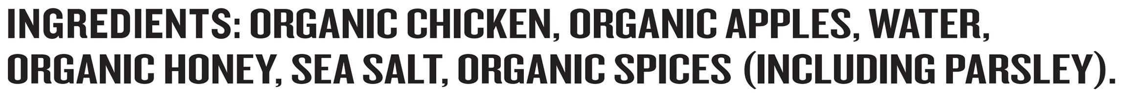 Ingredients: Organic Chicken (Chicken Never Administered Antibiotics or Animal By-Products), Organic Apples, Water, Organic Honey, Sea Salt, Organic Spices (Including Parsley)