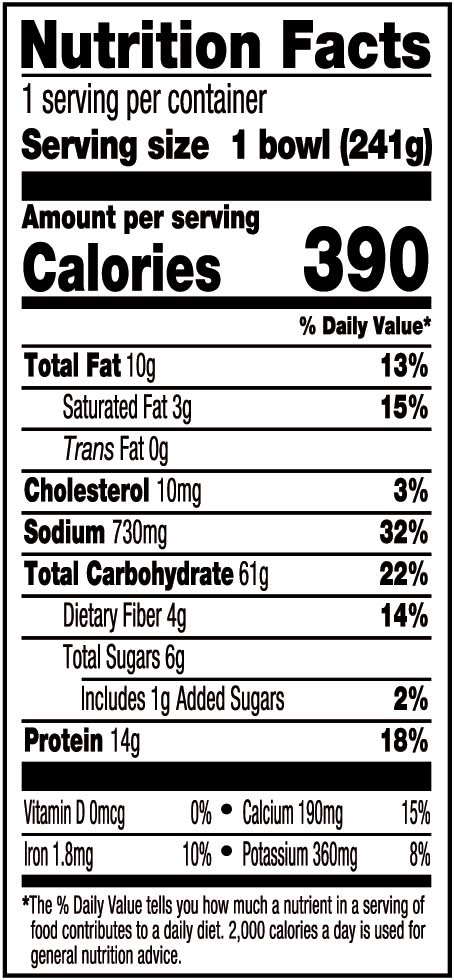 Directions for use: Directions: Ovens may vary. Microwave Oven: Make a 1-inch slit in overwrap. Cook on high for 3 minutes. Remove overwrap. Stir. Cook on high for 1 more minute. Let sit 1 minute. Serve. Conventional Oven: Preheat oven to 375 degrees F. Remove overwrap. Place bowl on a baking sheet. Bake for 40-45 minutes. Let sit 1 minute. Serve. Toaster Oven: Remove overwrap and bowl. Place in an oven-safe dish. Follow conventional oven directions ,Perishable. Keep frozen. Storage recommendation: Perishable. Keep frozen.