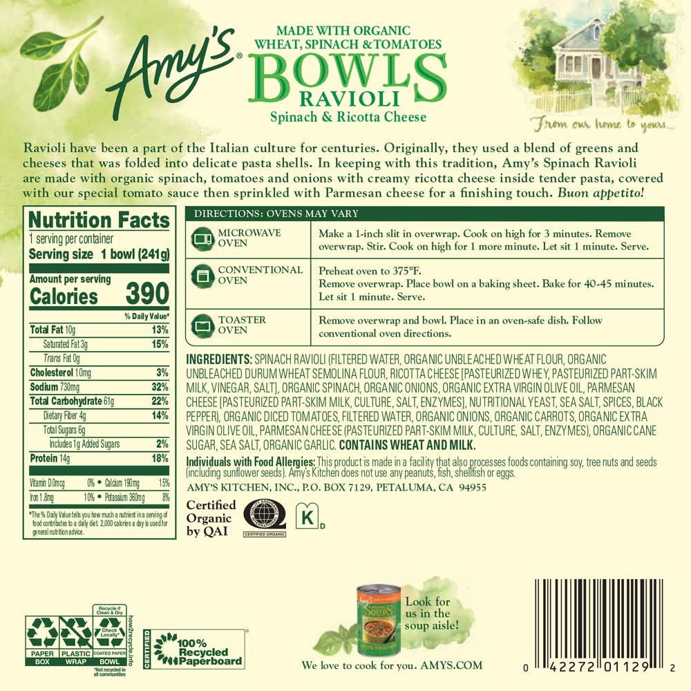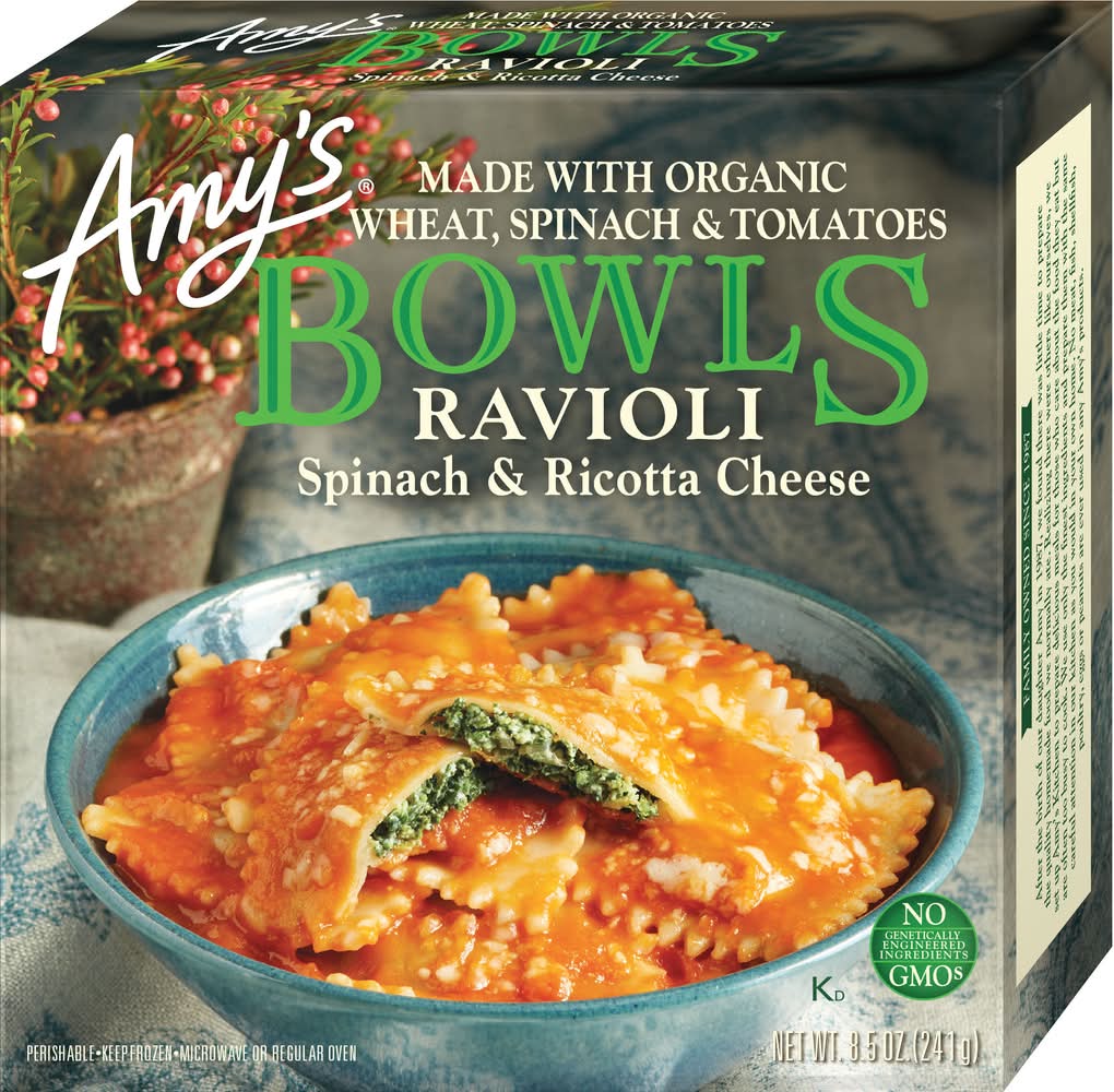 Spinach Ravioli Bowl • Flavor: Spinach-ricotta cheese • Amy's Kitchen, Inc., PO Box 7129,Petaluma,CA,94955 • Packaging: Reusable