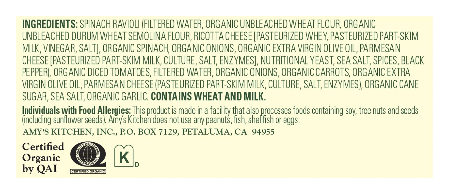 Ingredients: SPINACH RAVIOLI(FILTERED WATER, ORGANIC UNBLEACHED WHEAT FLOUR, ORGANIC UNBLEACHED DURUM WHEATSEMOLINA FLOUR, RICOTTA CHEESE [PASTEURIZED WHEY, PASTEURIZED PART-SKIM MILK, VINEGAR, SALT], ORGANIC SPINACH, ORGANIC ONIONS, ORGANIC EXTRA VIRGIN OLIVE OIL, PARMESAN CHEESE [PASTEURIZED PART-SKIM MILK, CULTURE, SALT, ENZYMES], NUTRITIONAL YEAST, SEA SALT, SPICES, BLACK PEPPER), ORGANIC DICED TOMATOES, FILTERED WATER, ORGANIC ONIONS, ORGANIC CARROTS, ORGANIC EXTRA VIRGIN OLIVE OIL, PARMESAN CHEESE (PASTEURIZED PART-SKIM MILK, CULTURE, SALT, ENZYMES), ORGANIC CANE SUGAR, SEA SALT, ORGANIC GARLIC. CONTAINS WHEAT AND MILK. Contains: Contains Wheat', 'Contains Milk', May Contain Soybeans', 'May Contain Tree Nuts'