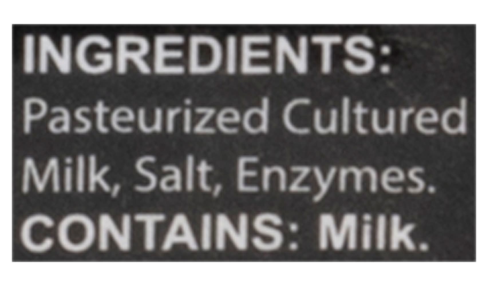 Ingredients: Pasteurized Cultured Milk, Salt, Enzymes Contains: Milk
