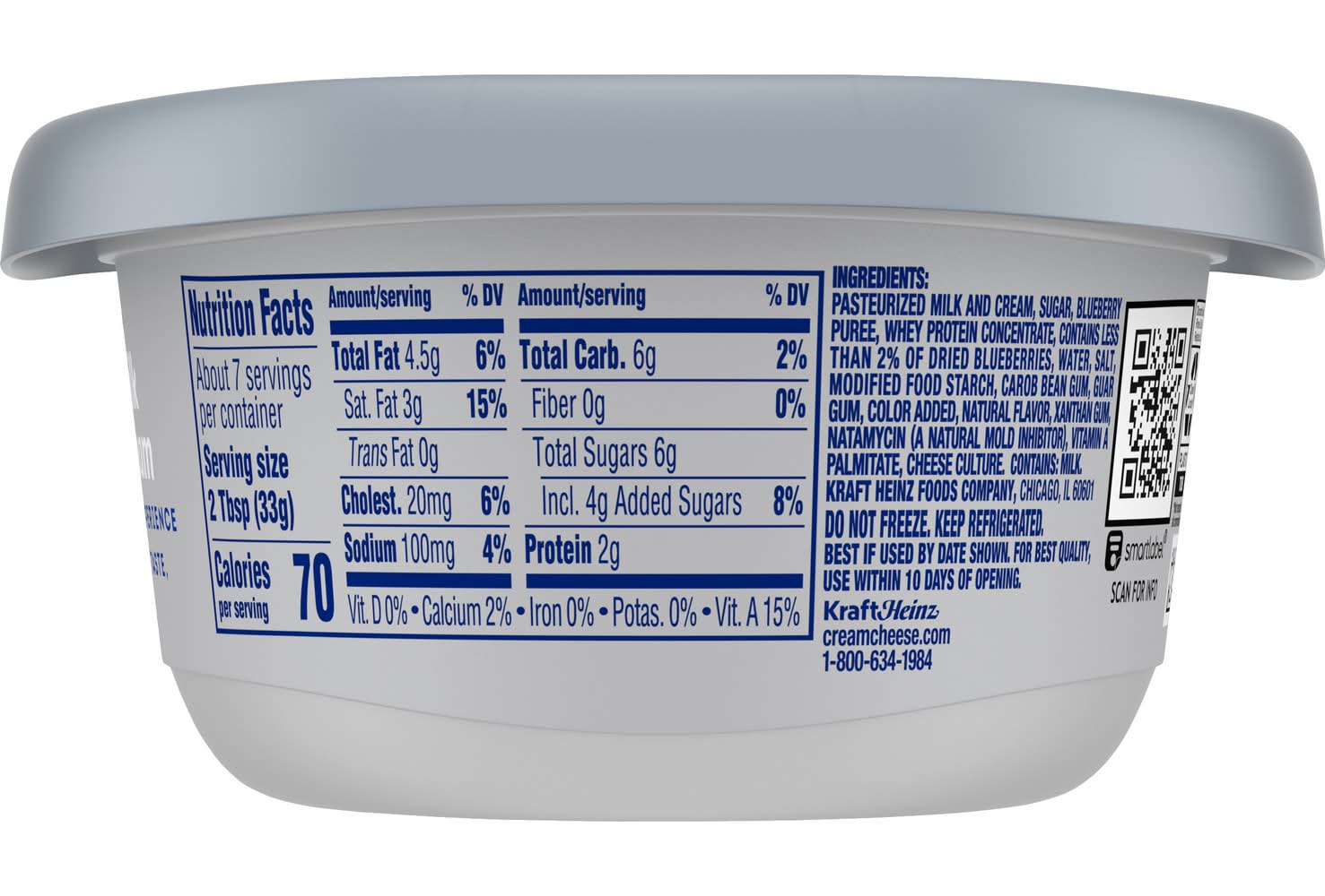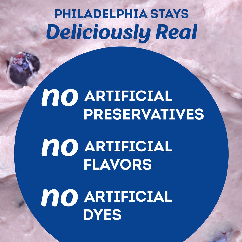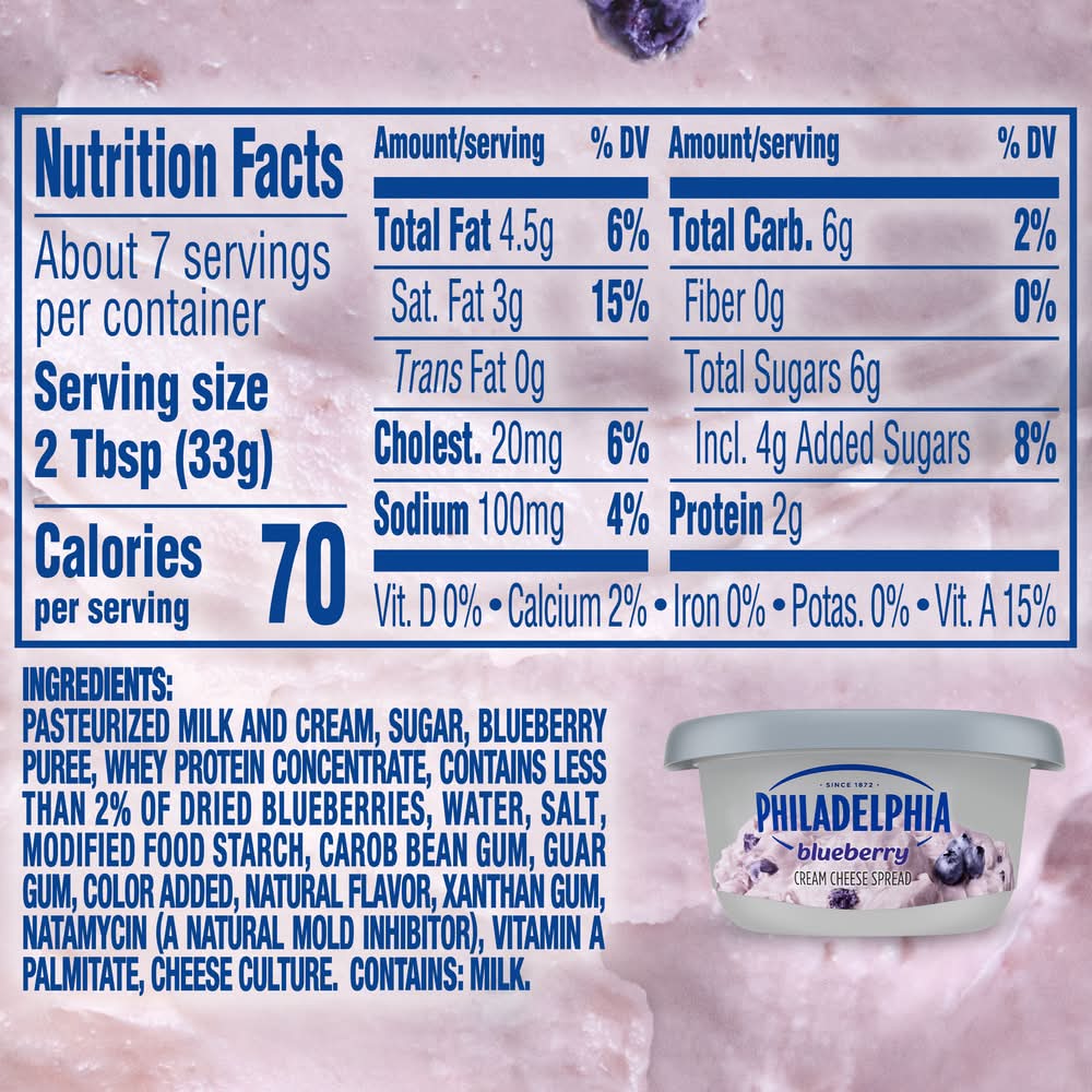 Dive into immersive pleasure with Philadelphia Blueberry Cream Cheese Spread. Made with fresh milk, real cream and blueberries for an extra creamy, multi-dimensional taste you can add to any meal. At Philly, we leave out the artificial preservatives, flavors and dyes to ensure a rich, quality flavor. Our sweet cream cheese spread is easy to spread, making it the perfect choice for adding to your morning bagel or crafting a decadent fruity dessert. With Philadelphia Cream Cheese Spread, enjoy a rich, creamy experience you don't just taste, you feel. • Flavor: Blueberry • Number of servings: 7 • Packaging: Reusable