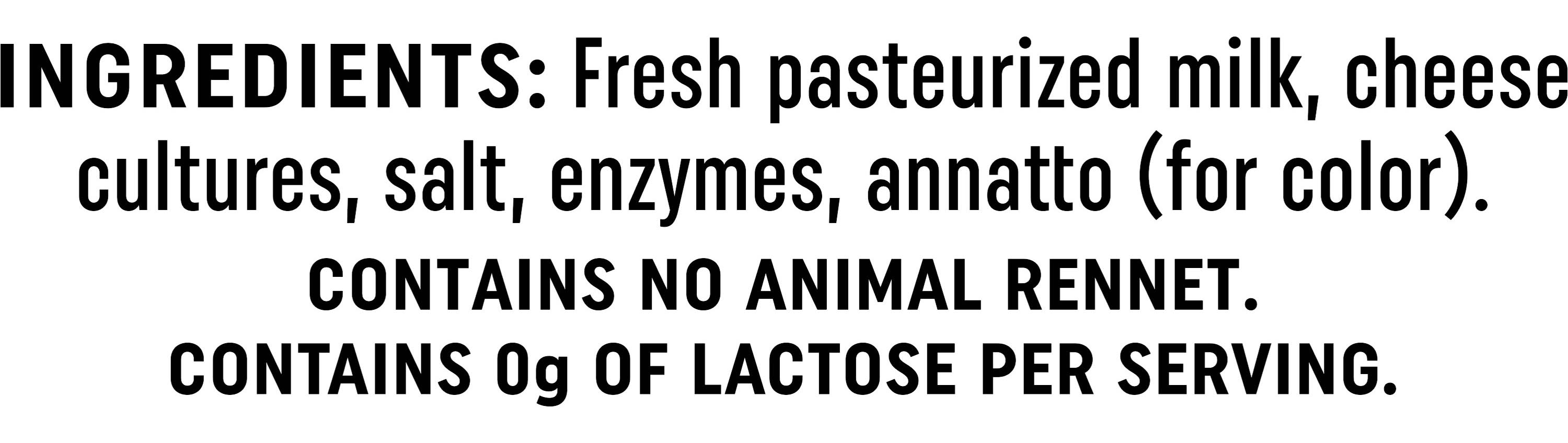 Ingredients: Fresh pasteurized milk, cheese cultures, salt, enzymes, annatto (for color), . Contains: Milk