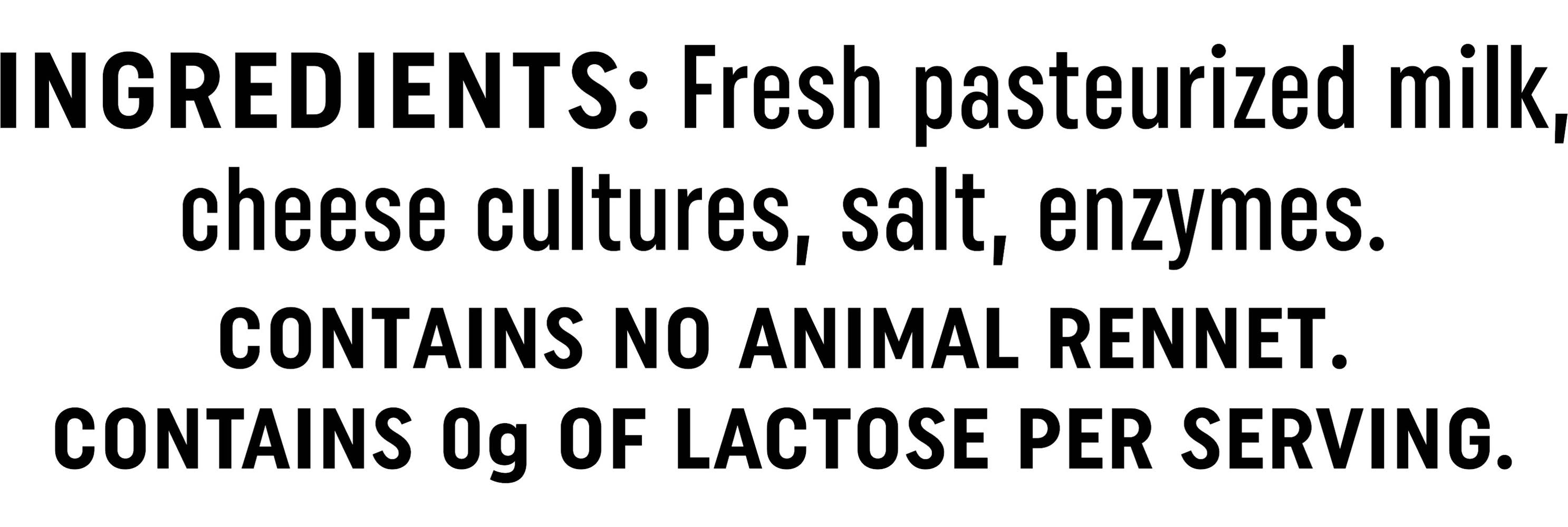 Ingredients: Fresh pasteurized milk, cheese cultures, salt, enzymes Contains: Milk