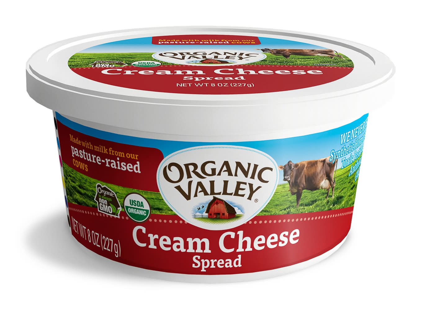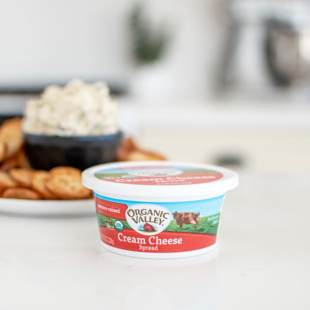 Organic Valley Organic Cream Cheese Spread is the perfect blend of savory, sweet, salty and smooth. This spreadable cream cheese is made with organic milk from pasture raised cows, and it contains no antibiotics, synthetic hormones, toxic pesticides or GMOs. Use this plain cream cheese as a spread for bagels or crackers, or add it to cream cheese frosting or cream cheese dip recipes. • Organic Valley, La Farge, WI 54639 • Packaging: Reusable