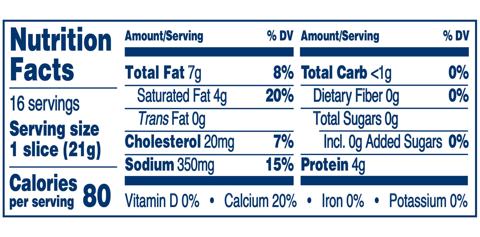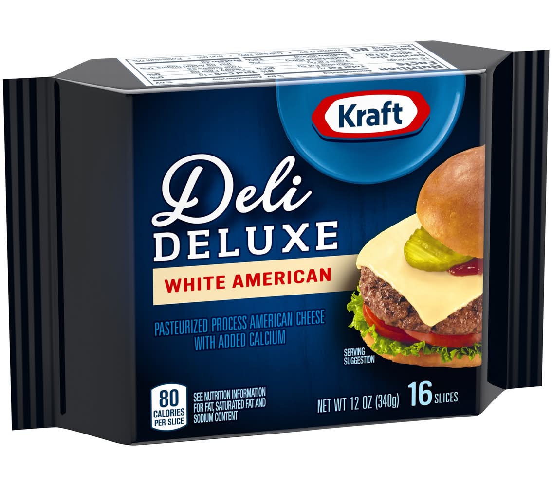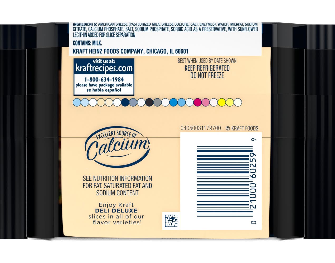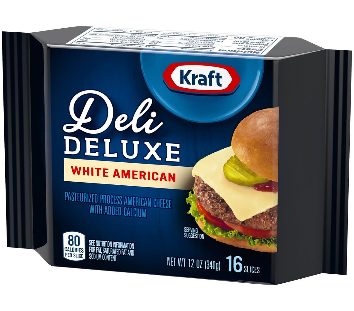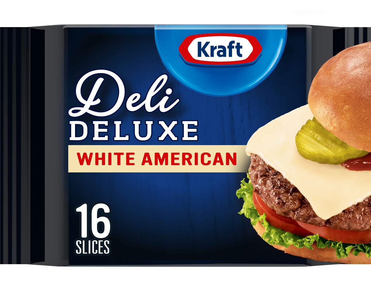 Kraft Deli Deluxe White American Cheese Slices are decadent and creamy for the perfect melt on all your family's favorites. This classic American cheese offers a rich flavor that takes all your recipes to the next level of deliciousness. Since the deli style white American cheese comes conveniently pre-sliced, meal preparation is easy. It's made with milk and contains 80 calories per serving while providing an excellent source of calcium, see nutrition information for fat, saturated fat and sodium content. Use this easy to melt cheese to make mouthwatering grilled cheese sandwiches for lunch, or top burgers at dinnertime. Each 12 ounce package of contains 16 deli style American cheese slices. Do not freeze; keep refrigerated. • Number of servings: 16 • Kraft Foods, Chicago , IL , 60601, Ph: 800-634-1984