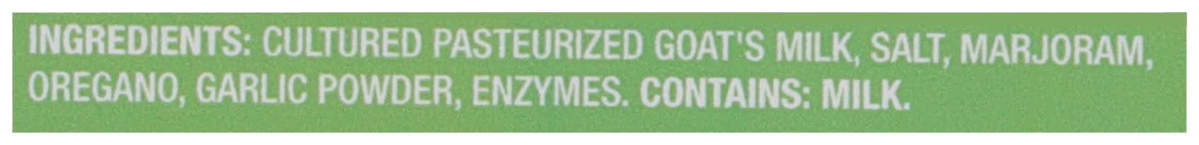 Ingredients: Cultured Pasteurized Goat's Milk, Salt, Marjoram, Oregano, Garlic Powder, Enzymes Contains: Milk