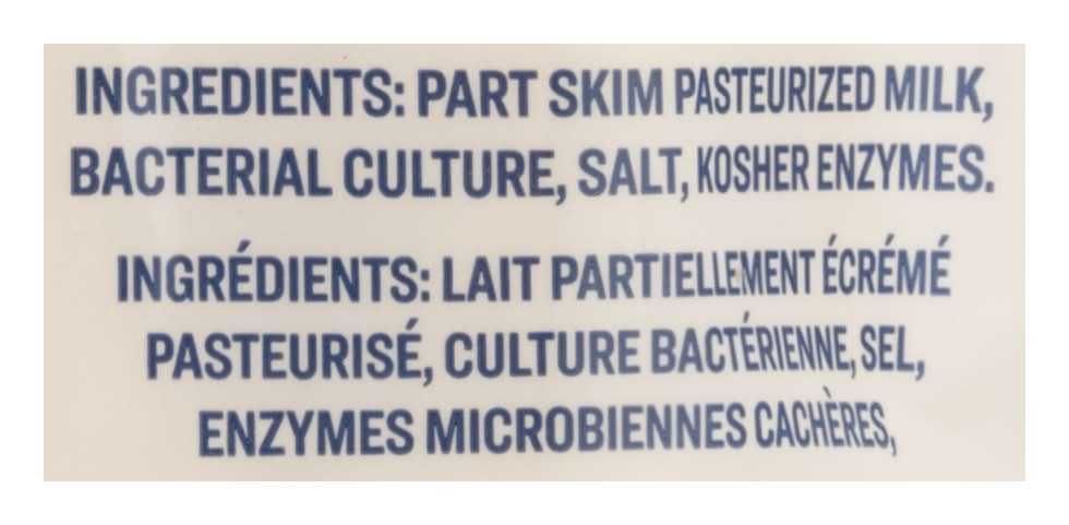 Ingredients: Part Skim Pasteurized Milk, Bacterial Culture, Salt, Kosher Enzymes