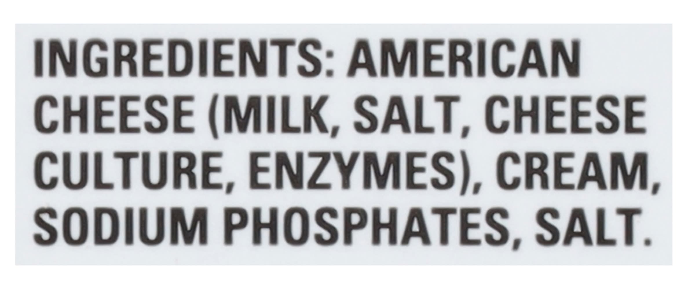 Ingredients: American Cheese (Milk, Salt, Cheese Culture, Enzymes), Cream, Sodium Phosphates, Salt Contains: Milk
