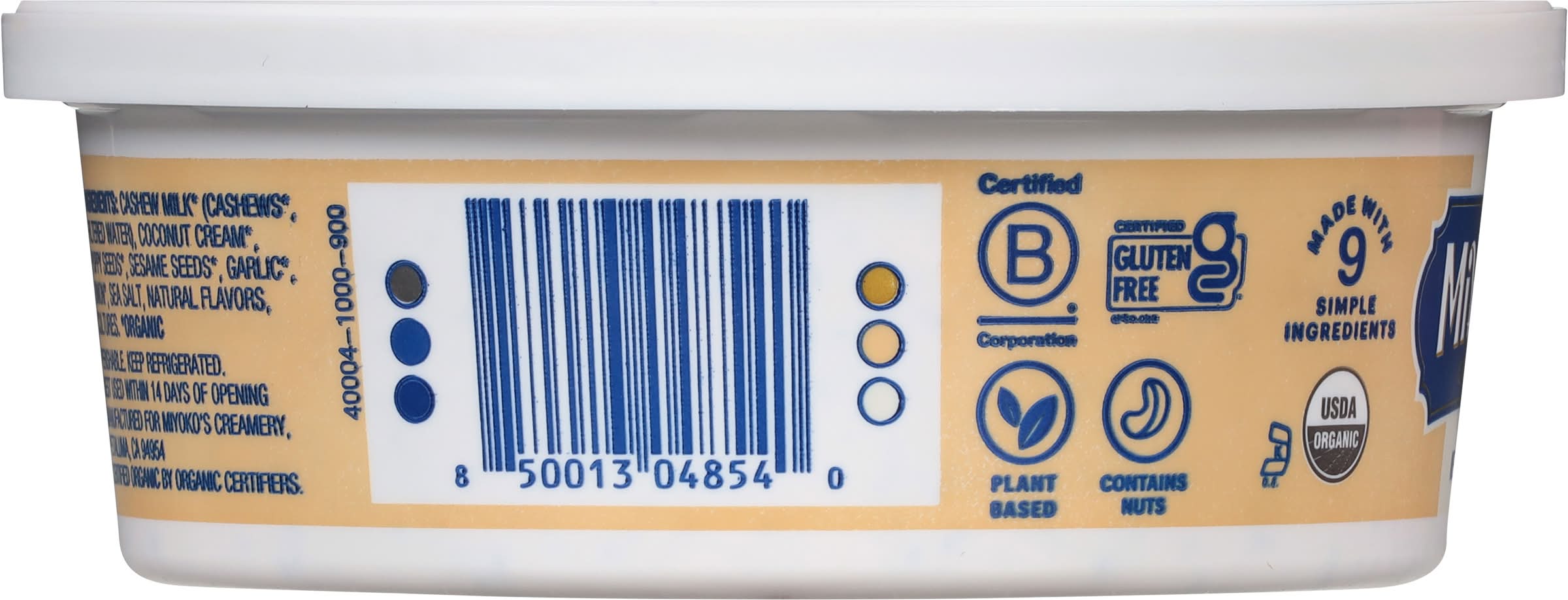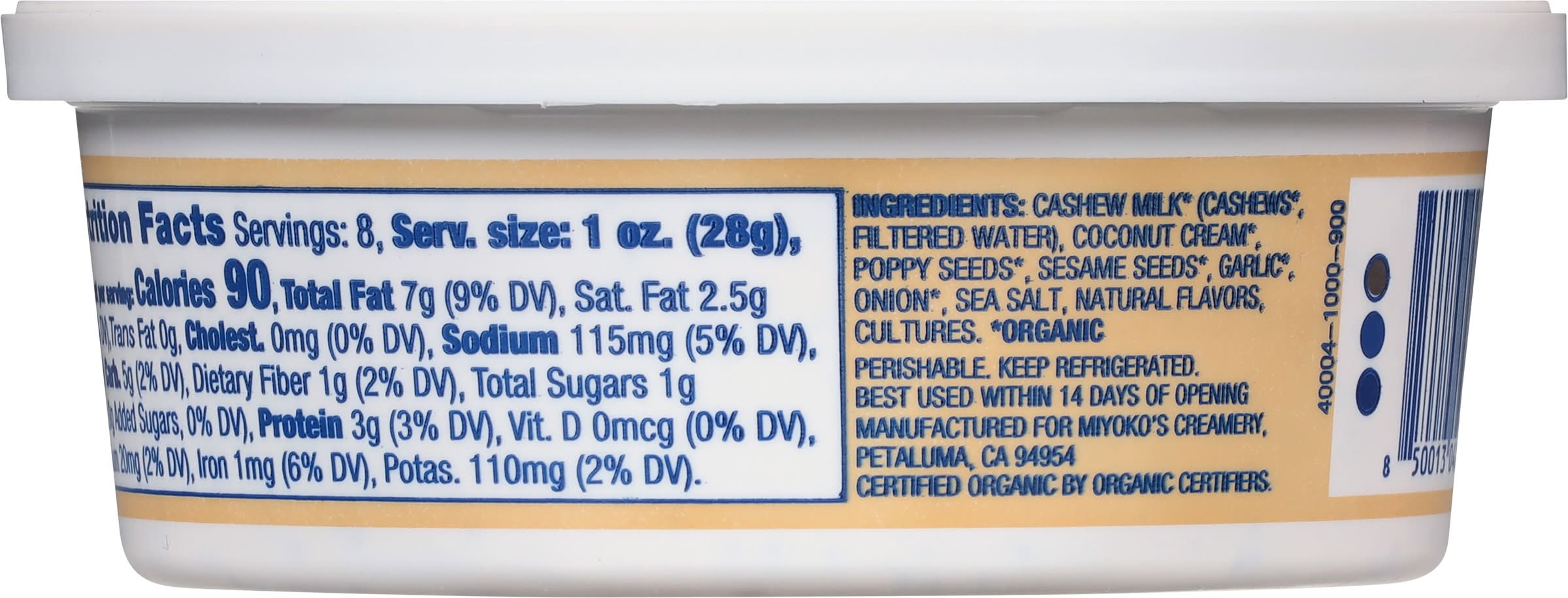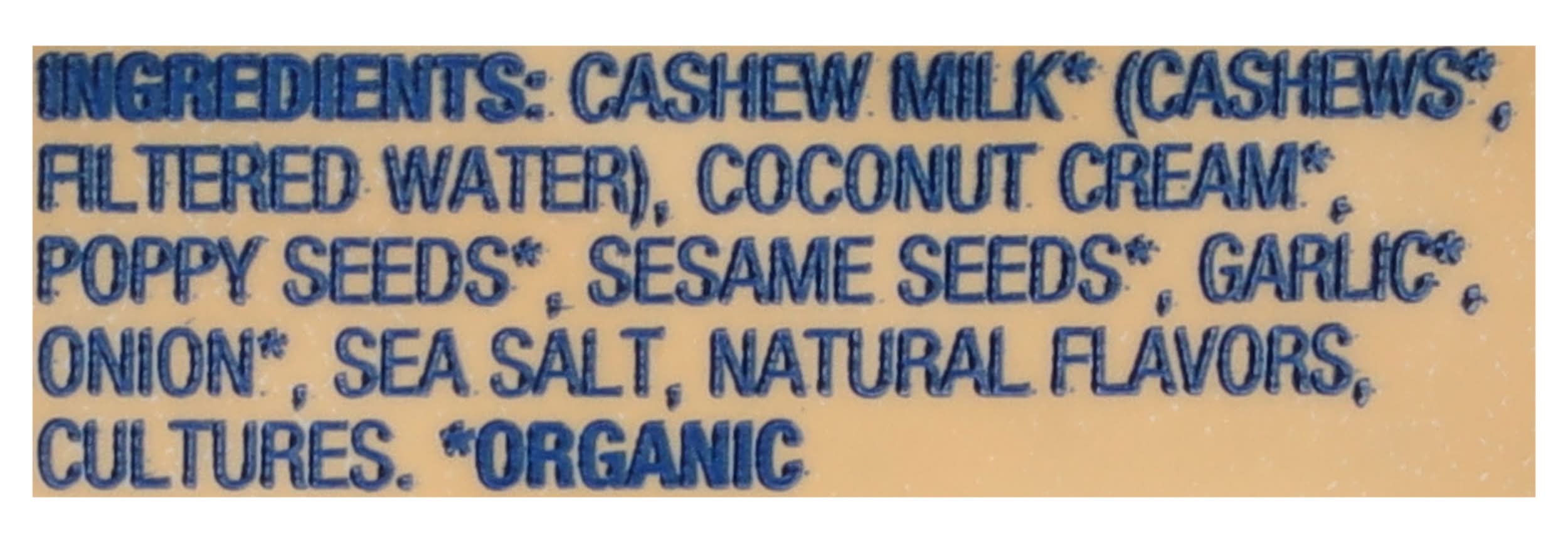 Ingredients: Cashew Milk* (Cashews*, Filtered Water), Coconut Cream* Poppy Seeds*, Sesame Seeds*, Garlic*, Onion*, Sea Salt, Natural Flavors, Cultures. * Organic Contains: Tree Nuts, Cashews, Tree Nuts, Coconuts, Sesame
