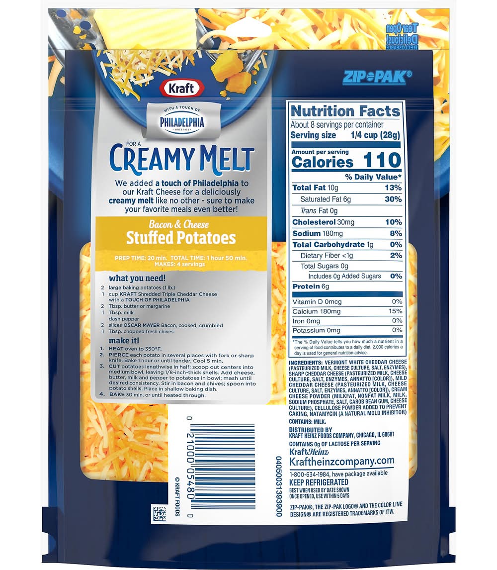 Ingredients: VERMONT WHITE CHEDDAR CHEESE (PASTEURIZED MILK, CHEESE CULTURE, SALT, ENZYMES), SHARP CHEDDAR CHEESE (PASTEURIZED MILK, CHEESE CULTURE, SALT, ENZYMES, ANNATTO [COLOR]), MILD CHEDDAR CHEESE (PASTEURIZED MILK, CHEESE CULTURE, SALT, ENZYMES, ANNATTO [COLOR]), CREAM CHEESE POWDER (MILKFAT, NONFAT MILK, MILK, SODIUM PHOSPHATE, SALT, CAROB BEAN GUM, CHEESE CULTURE), MODIFIED FOOD STARCH ADDED TO PREVENT CAKING, NATAMYCIN (A NATURAL MOLD INHIBITOR). Contains: CONTAINS: MILK.