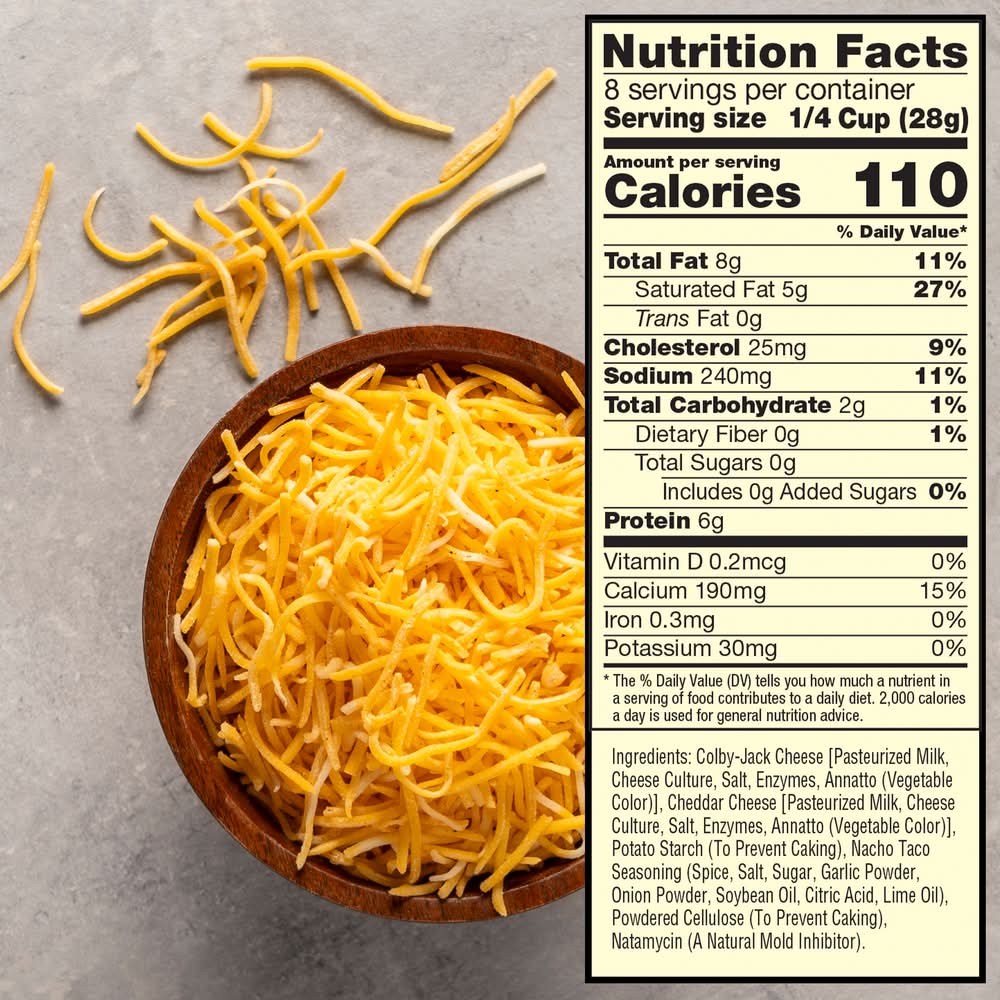 Ingredients: Colby-Jack Cheese [Pasteurized Milk, Cheese Culture, Salt, Enzymes, Annatto (Vegetable Color)], Cheddar Cheese [Pasteurized Milk, Cheese Culture, Salt, Enzymes, Annatto (Vegetable Color)], Potato Starch (To Prevent Caking), Nacho Taco Seasoning (Spice, Salt, Sugar, Garlic Powder, Onion Powder, Soybean Oil, Citric Acid, Lime Oil), Powdered Cellulose (To Prevent Caking), Natamycin (A Natural Mold Inhibitor), . Contains: 'Milk Contains', 'Soybeans Contains'
