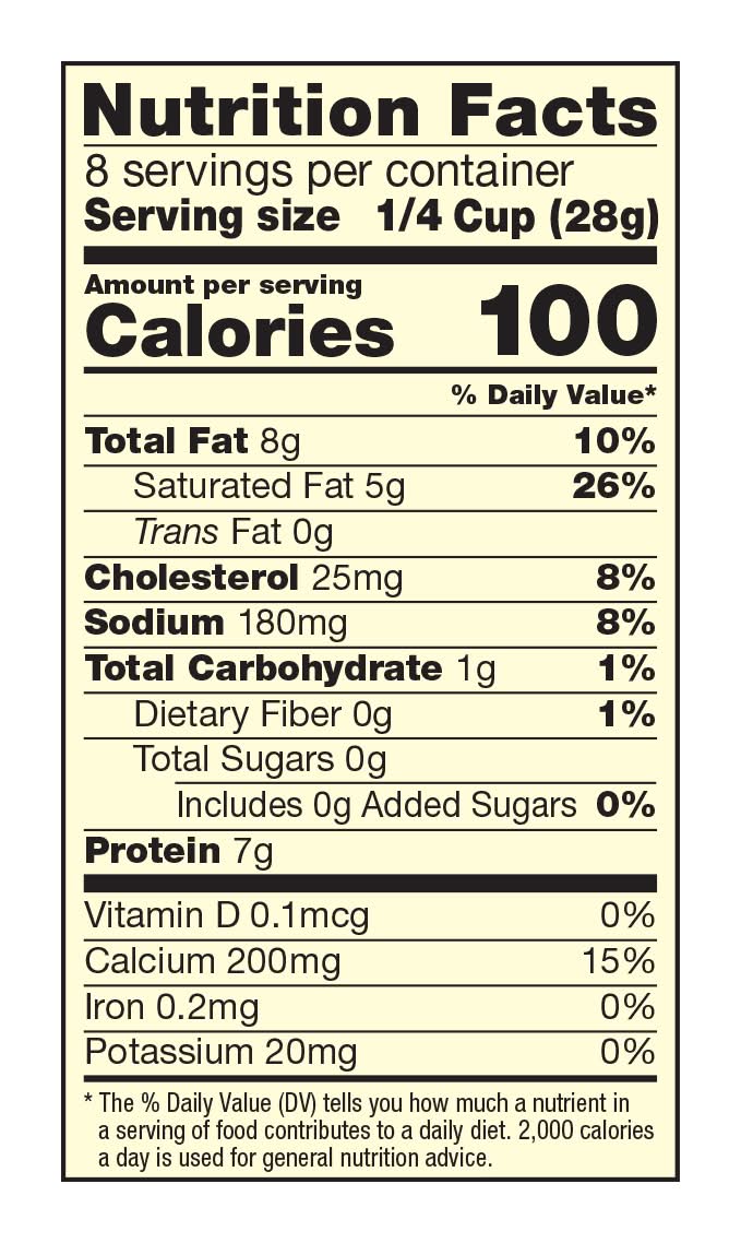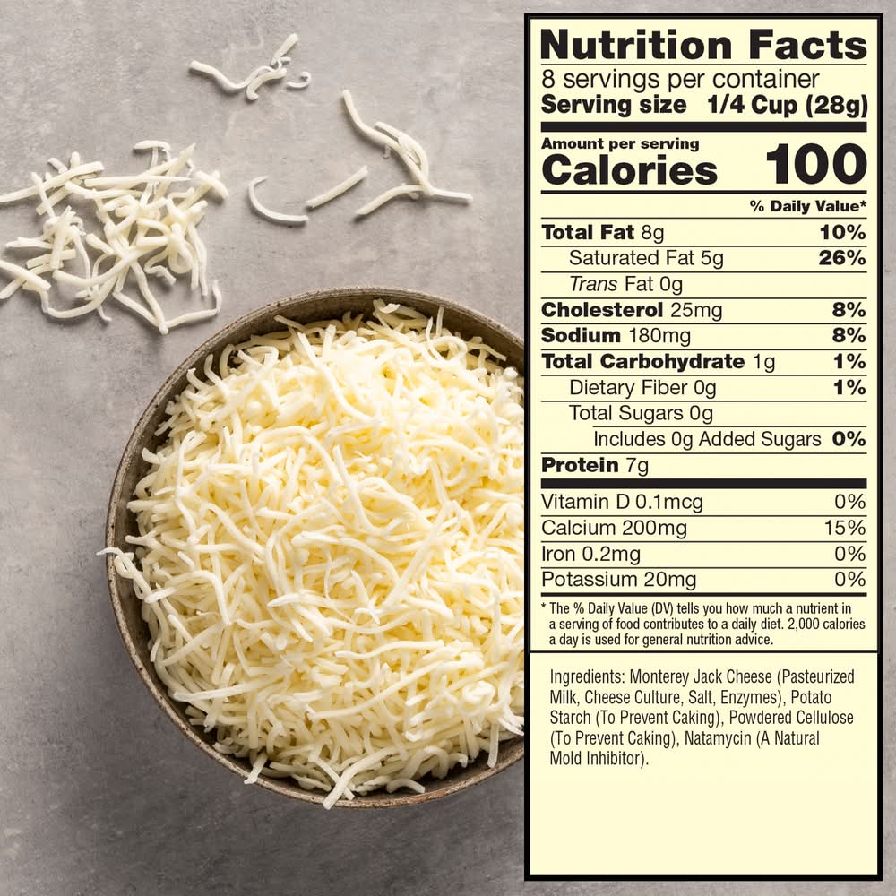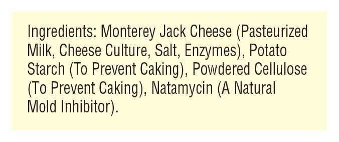 Ingredients: Monterey Jack Cheese (Pasteurized Milk, Cheese Culture, Salt, Enzymes), Potato Starch and Powdered Cellulose (To Prevent Caking), Natamycin (A Natural Mold Inhibitor), .