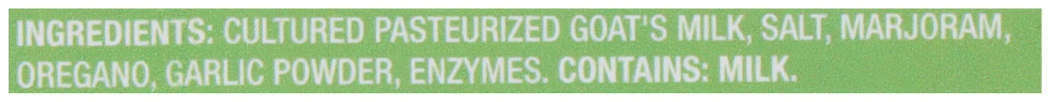 Ingredients: Cultured Pasteurized Goat’s Milk, Salt, Marjoram, Oregano, Garlic Powder, Enzymes Contains: Milk