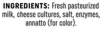 Ingredients: Fresh pasteurized milk, cheese cultures, salt, enzymes, annatto (for color) Contains: Milk