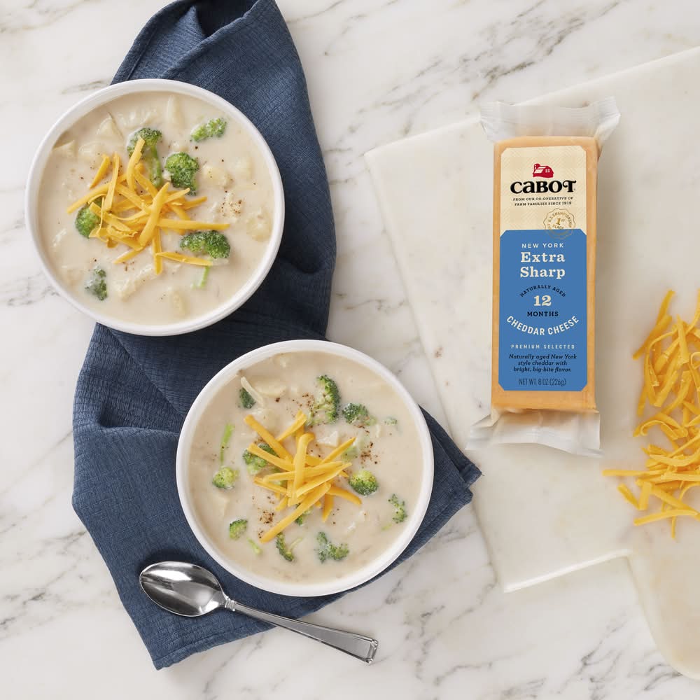 Cabot's New York Extra Sharp Cheddar is aged to sharp, tangy Cheddar perfection. With hints of grapefruit and bergamot, this Cheddar stands on its own, or adds unexpected zing to a bowl of pasta, or atop deli sandwiches. Pair it with olives for a simple, savory appetizer, melt it for a gooey grilled cheese, or stir it into a bold cheese sauce. Naturally gluten-free with zero grams of lactose, there's no wrong way to enjoy cheddar this good. Cabot Creamery is a farmer-owned cooperative and certified B-Corp that’s been making award-winning products for over a century. Cabot Creamery Co-operative, Cabot,VT,05647