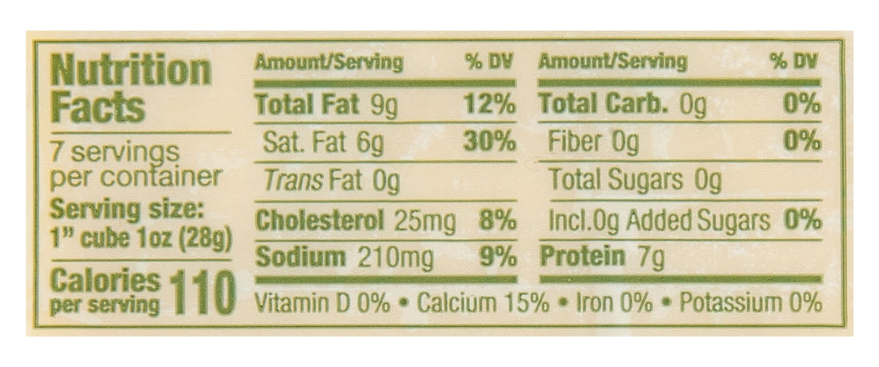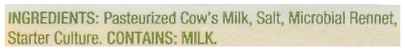 Ingredients: Pasteurized Cow's Milk, Salt, Microbial Rennet, Starter Culture Contains: Milk