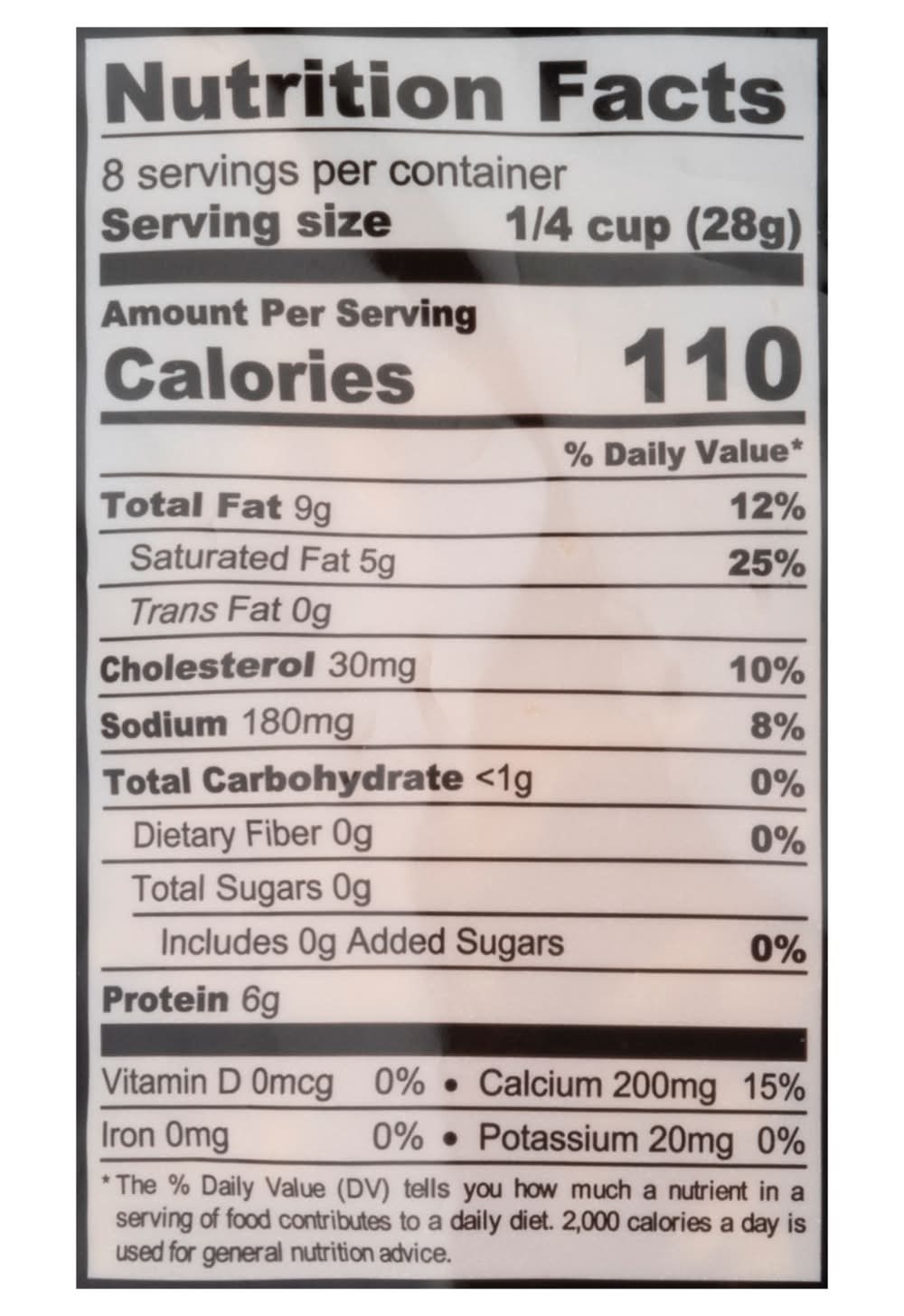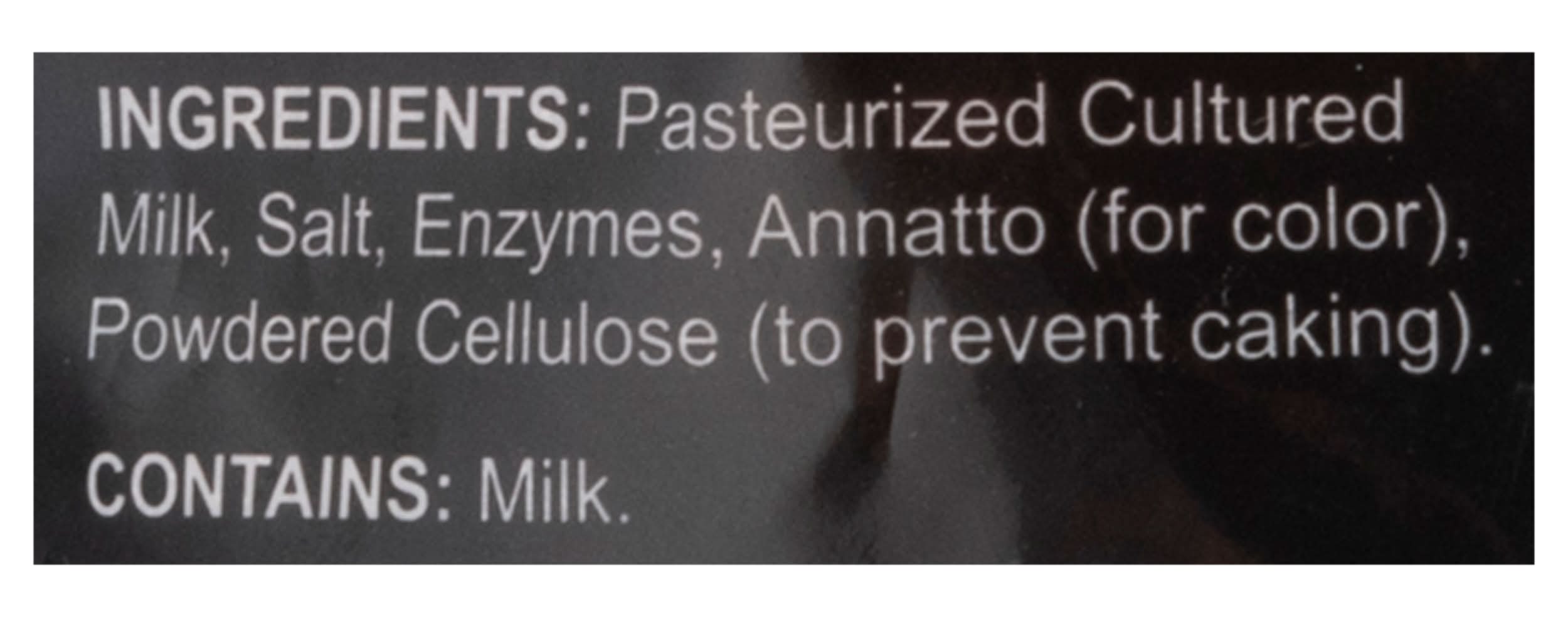 Ingredients: Pasteurized Cultured Milk, Salt, Enzymes, Annatto (for Color), Powdered Cellulose (to Prevent Caking) Contains: Milk