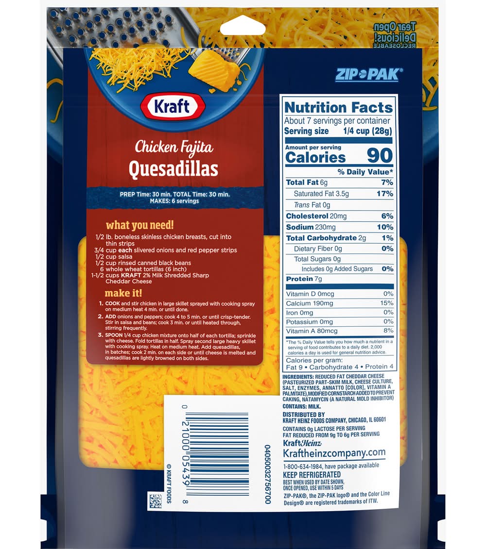 Ingredients: REDUCED FAT CHEDDAR CHEESE (PASTEURIZED PART-SKIM MILK, CHEESE CULTURE, SALT, ENZYMES, ANNATTO [COLOR], VITAMIN A PALMITATE), MODIFIED CORNSTARCH ADDED TO PREVENT CAKING, NATAMYCIN (A NATURAL MOLD INHIBITOR) Contains: CONTAINS: MILK.