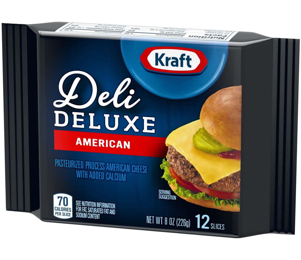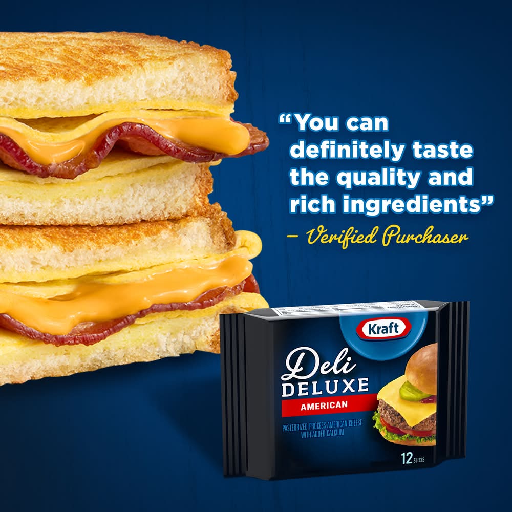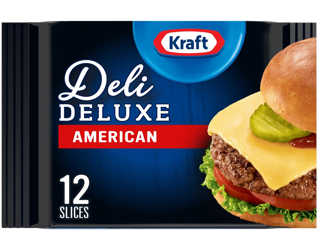 Kraft Deli Deluxe American Cheese Slices are creamy, rich and full of flavor. This sliced American cheese features a mild, slightly tangy flavor and smooth texture that goes well with meat and vegetable dishes. Pre-sliced for your convenience, this deli style American cheese is perfect for slipping into sandwiches or snacking on straight from the package. Kraft Deli Deluxe cheeses are made with quality ingredients like pasteurized milk for full flavor and consistency. These slices contain 20% daily value of calcium per serving, see nutrition information for saturated fat and sodium content. Put one of these creamy American cheese slices on any sandwich or burger for the perfect melt, or add them to a cheese sauce to elevate your classic mac and cheese recipe. For optimum flavor, keep this 8 ounce package of 12 American cheese slices in the fridge until use. Kraft Heinz Foods Company, Chicago,IL,60601