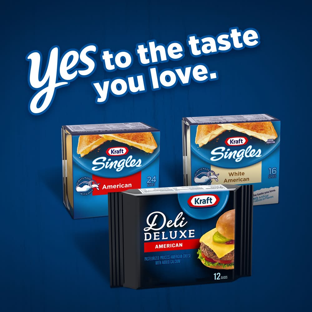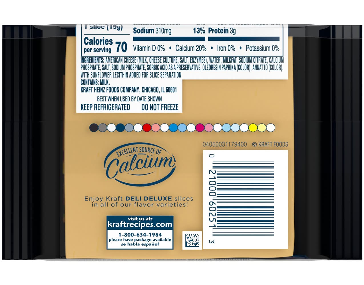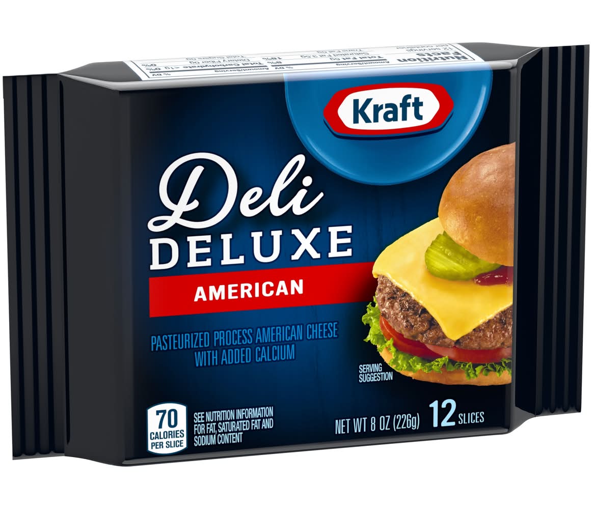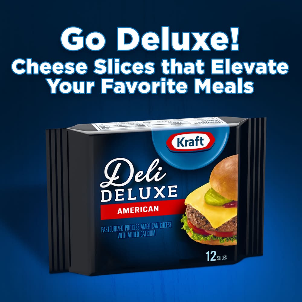 Kraft Deli Deluxe American Cheese Slices are creamy, rich and full of flavor. This sliced American cheese features a mild, slightly tangy flavor and smooth texture that goes well with meat and vegetable dishes. Pre-sliced for your convenience, this deli style American cheese is perfect for slipping into sandwiches or snacking on straight from the package. Kraft Deli Deluxe cheeses are made with quality ingredients like pasteurized milk for full flavor and consistency. These slices contain 20% daily value of calcium per serving, see nutrition information for saturated fat and sodium content. Put one of these creamy American cheese slices on any sandwich or burger for the perfect melt, or add them to a cheese sauce to elevate your classic mac and cheese recipe. For optimum flavor, keep this 8 ounce package of 12 American cheese slices in the fridge until use. Kraft Heinz Foods Company, Chicago,IL,60601