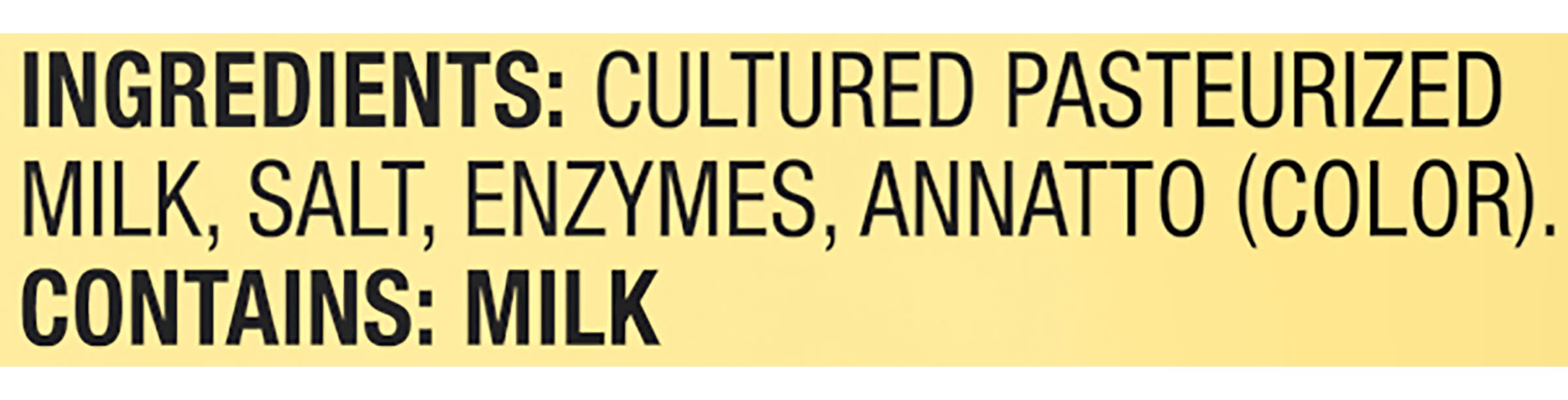 Ingredients: Cultured Pasteurized Milk, Salt, Enzymes, Annatto (Color) Contains: Milk