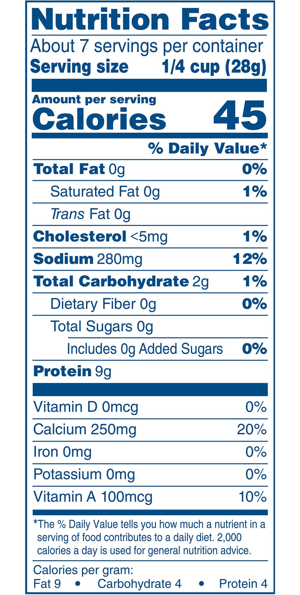 Ingredients: Nonfat Cheddar Cheese Cheese Culture Salt Enzymes Yeast Natural Flavor, Colored With Annatto And Titanium Dioxide Vitamin A Palmitate Modified Cornstarch Added To Prevent Caking Natamycin Contains: Milk, Corn