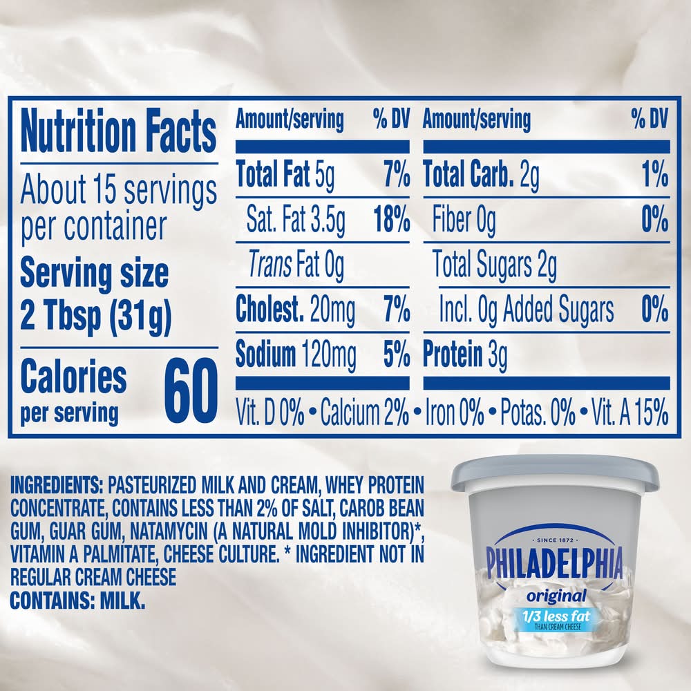 Dive into immersive pleasure with Philadelphia Reduced Fat Cream Cheese. Made with fresh milk and real cream for an extra creamy, multi-dimensional taste you can add to any meal. At Philly, we leave out the artificial preservatives, flavors and dyes to ensure a rich, quality flavor. Containing 1/3 the fat of our original cream cheese, Philadelphia is easy to spread, making it the perfect choice for adding to your morning bagel, elevating a breakfast sandwich or using in recipes. Keep our 16 ounce resealable container of cream cheese refrigerated. With Philadelphia Reduced Fat Cream Cheese, enjoy a rich, creamy experience you don't just taste, you feel. • Kraft Heinz Foods Company, Chicago, IL, 60601 • Packaging: Reusable