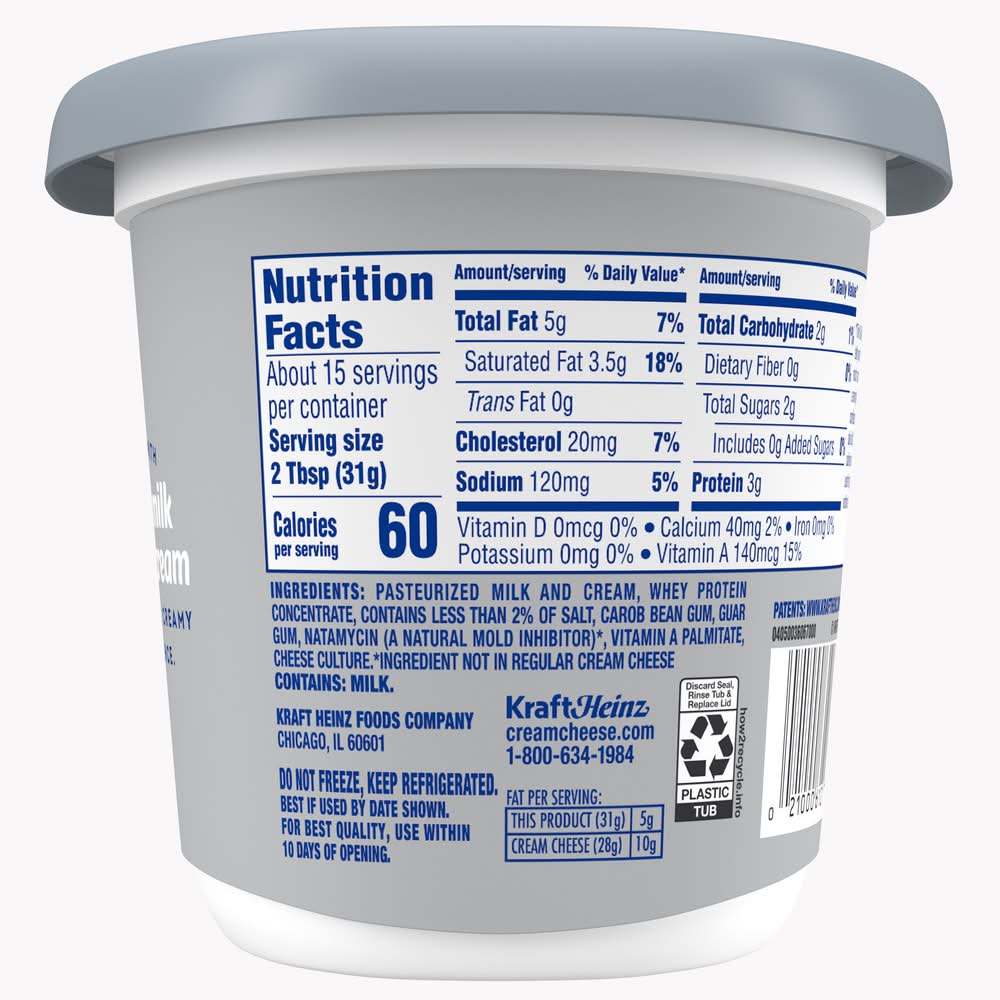 Ingredients: PASTEURIZED MILK AND CREAM, WHEY PROTEIN CONCENTRATE, CONTAINS LESS THAN 2% OF SALT, CAROB BEAN GUM, GUAR GUM, NATAMYCIN (A NATURAL MOLD INHIBITOR), *, VITAMIN A PALMITATE, CHEESE CULTURE.*INGREDIENT NOT IN REGULAR CREAM CHEESE Contains: CONTAINS: MILK.