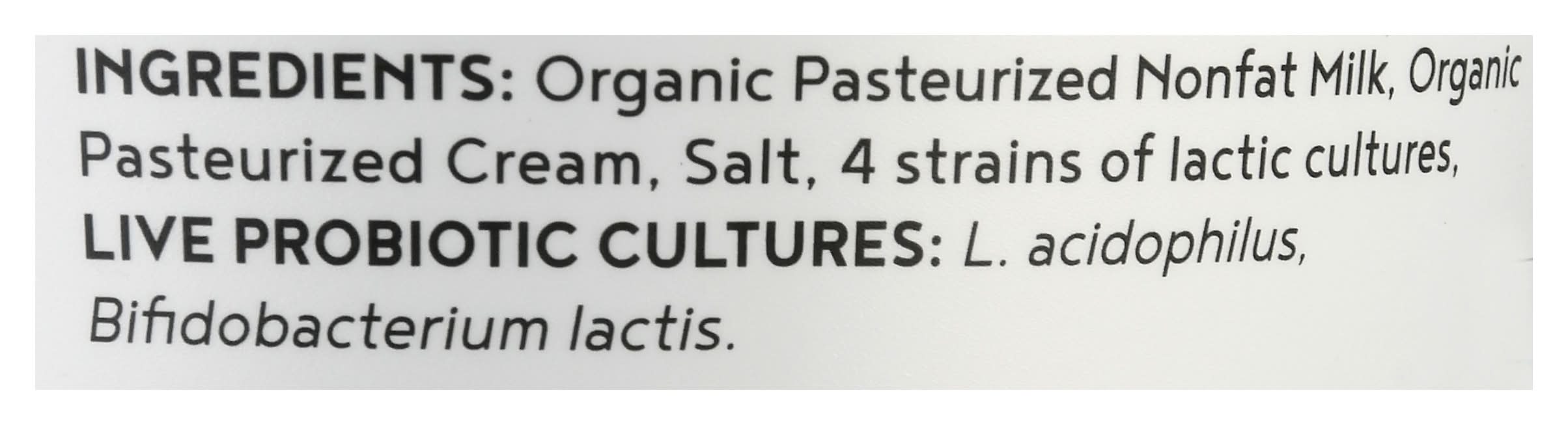 Ingredients: Organic Pasteurized Nonfat Milk, Organic Pasteurized Cream, Salt, 4 Strains of Lactic Cultures, Live Probiotic Cultures: L, Acidophilus, Bifidobacterium Lactis Contains: Milk