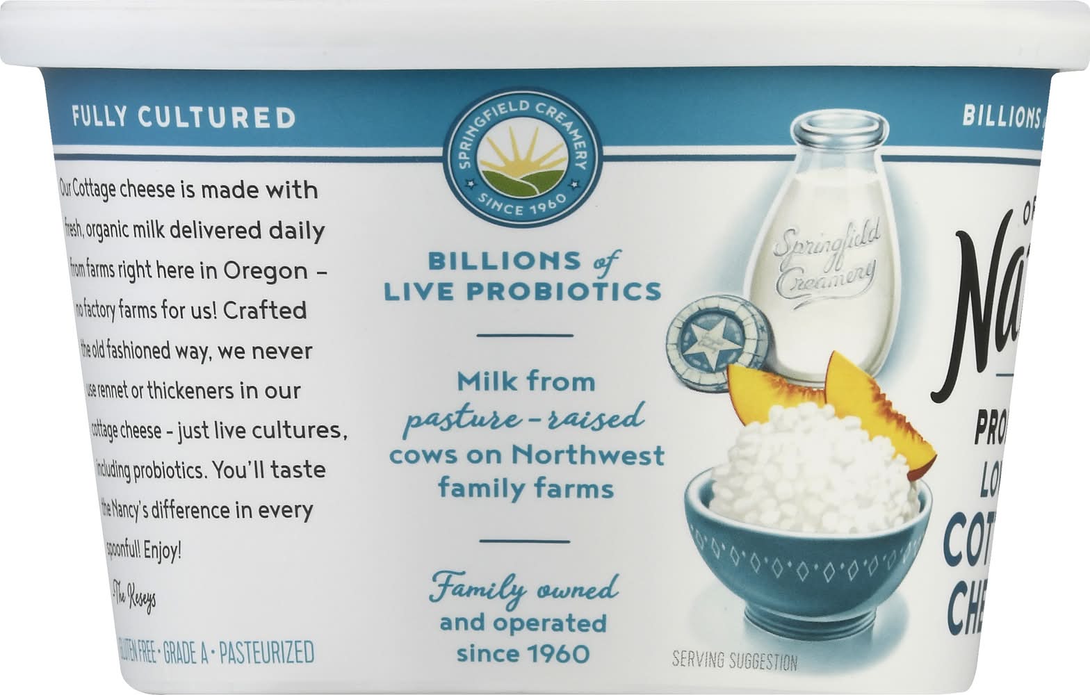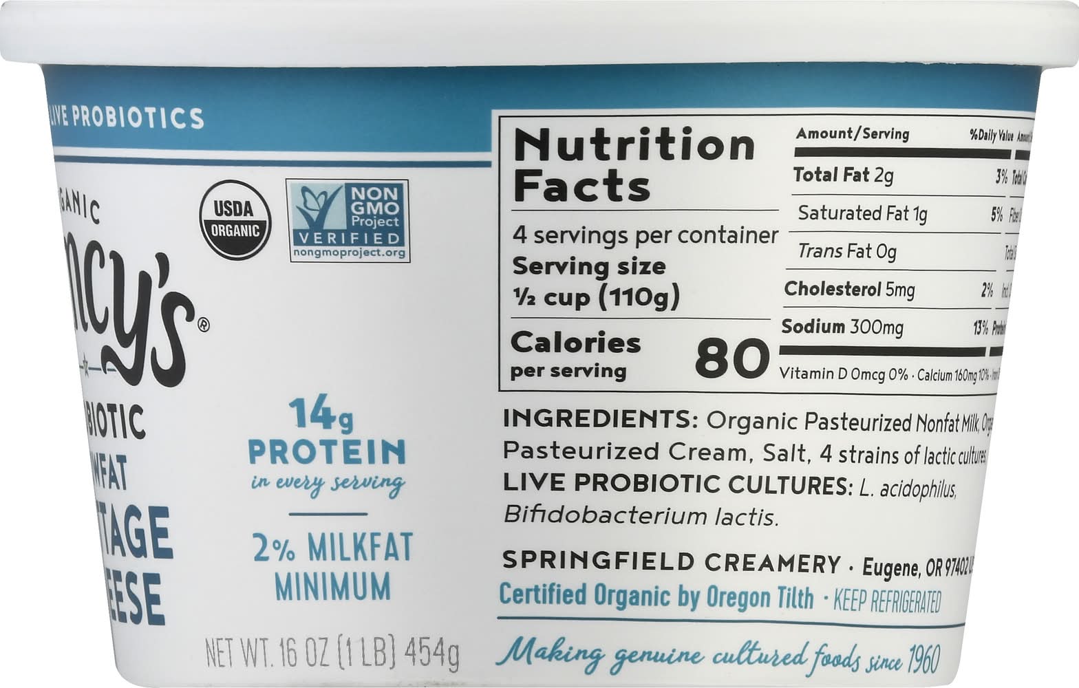 14 g protein in every serving. USDA Organic. Certified Organic by Oregon Tilth. Gluten free. 2% Low fat. Non GMO Project verified. nongmoproject.org. Billions of live probiotics. 2% milkfat minimum. Making genuine cultured foods since 1960. Fully cultured. Our cottage cheese is made with fresh, organic milk delivered daily from farms right here in Oregon - no factory farms for us! Crafted the old fashioned way. we never use rennet or thickeners in our cottage cheese - just live cultures. including probiotics. You'll taste the Nancy's difference in every spoonful! Enjoy Packaging: Reusable