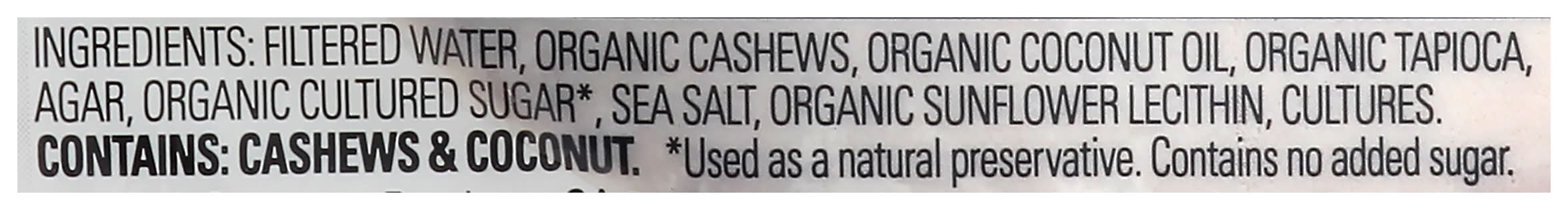 Ingredients: Filtered Water, Organic Cashews, Organic Coconut Oil, Organic Tapioca, Agar, Organic Cultured Sugar (Used as a Natural Preservative, Contains No Added Sugar, ), Sea Salt, Organic Sunflower Lecithin, Cultures Contains: Tree Nuts