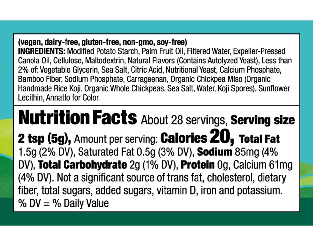 Ingredients: Modified Potato Starch, Palm Fruit Oil, Filtered Water, Expeller-Pressed Canola Oil, Cellulose, Maltodextrin, Natural Flavors (Contains Autolyzed Yeast), Less than 2% of: Vegetable Glycerin, Sea Salt, Citric Acid, Nutritional Yeast, Calcium Phosphate, Bamboo Fiber, Sodium Phosphate, Carrageenan, Organic Chickpea Miso (Organic Handmade Rice Koji, Organic Whole Chickpeas, Sea Salt, Water, Koji Spores), Sunflower Lecithin, Annatto for Color Contains: Milk